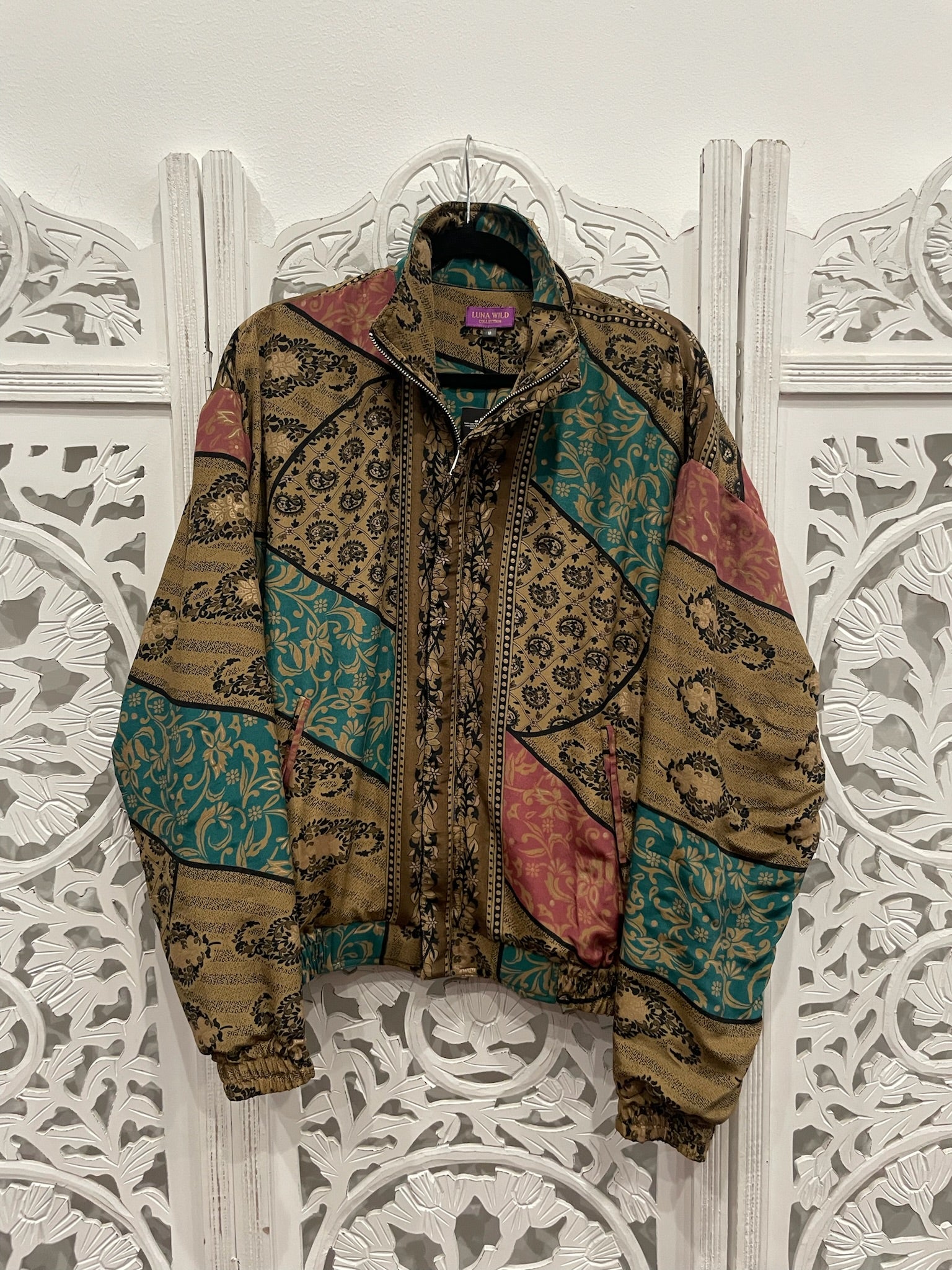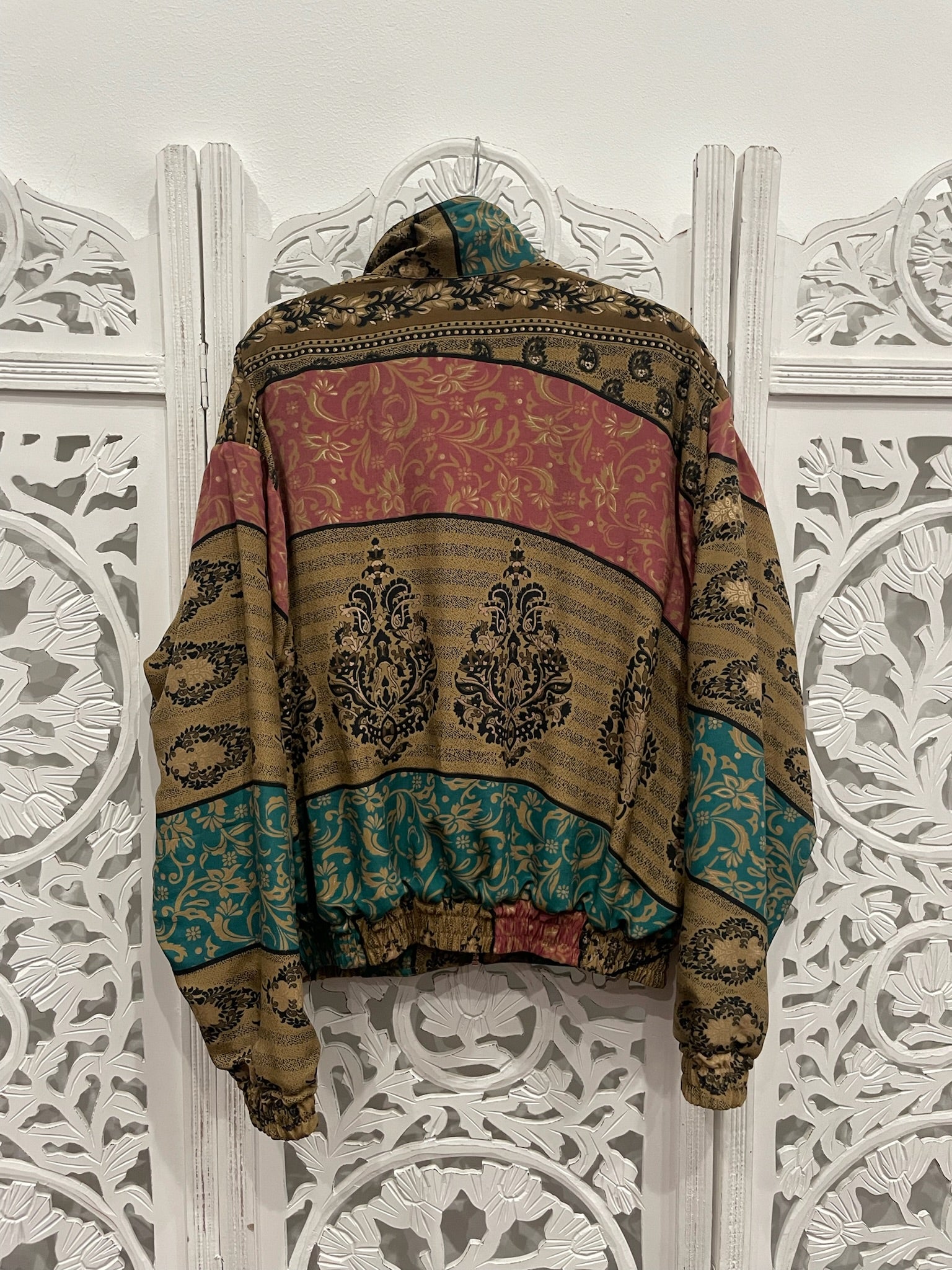 Each hooded bomber jacket flaunts an upcycled Indian sari, black cotton inner bodice lining, zipped inner stash pocket, two open outer pockets, and black cuffed waist and sleeves.