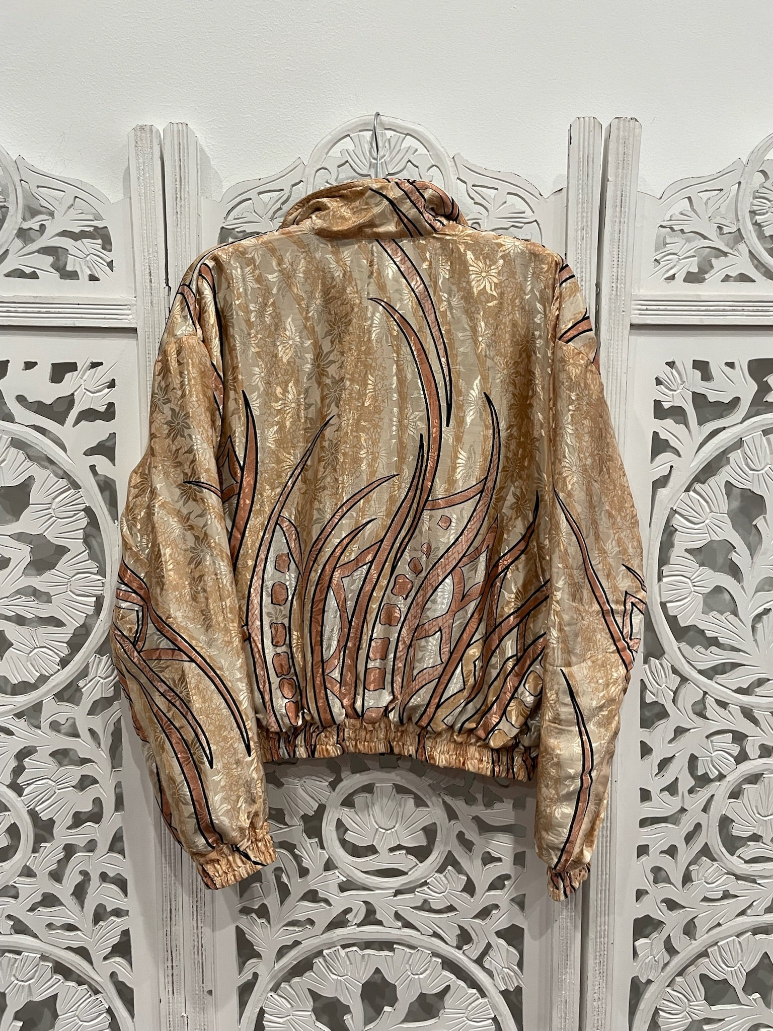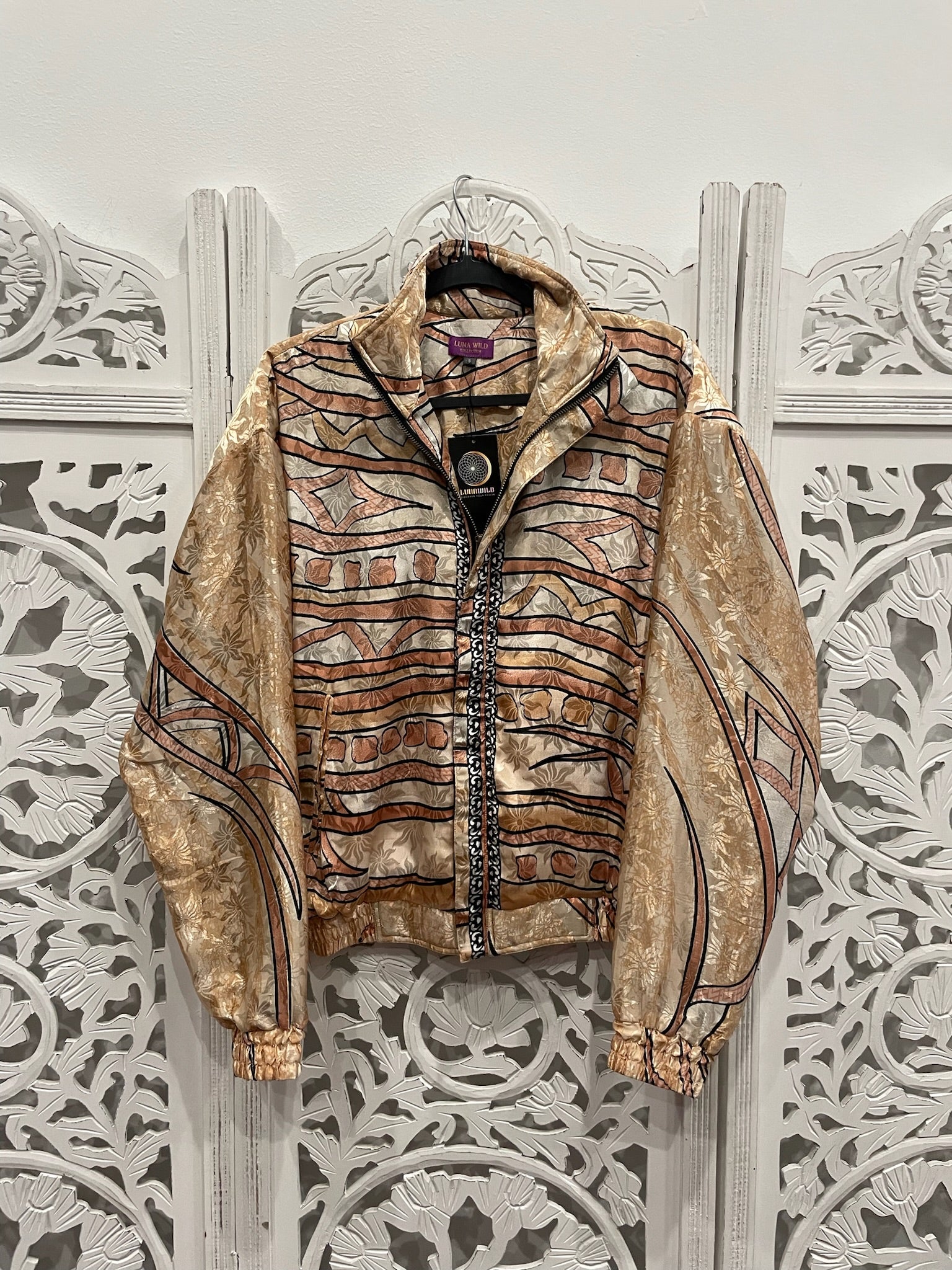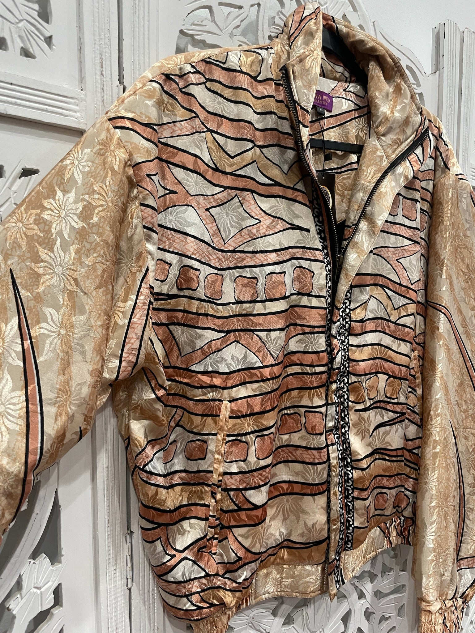 Each hooded bomber jacket flaunts an upcycled Indian sari, black cotton inner bodice lining, zipped inner stash pocket, two open outer pockets, and black cuffed waist and sleeves.