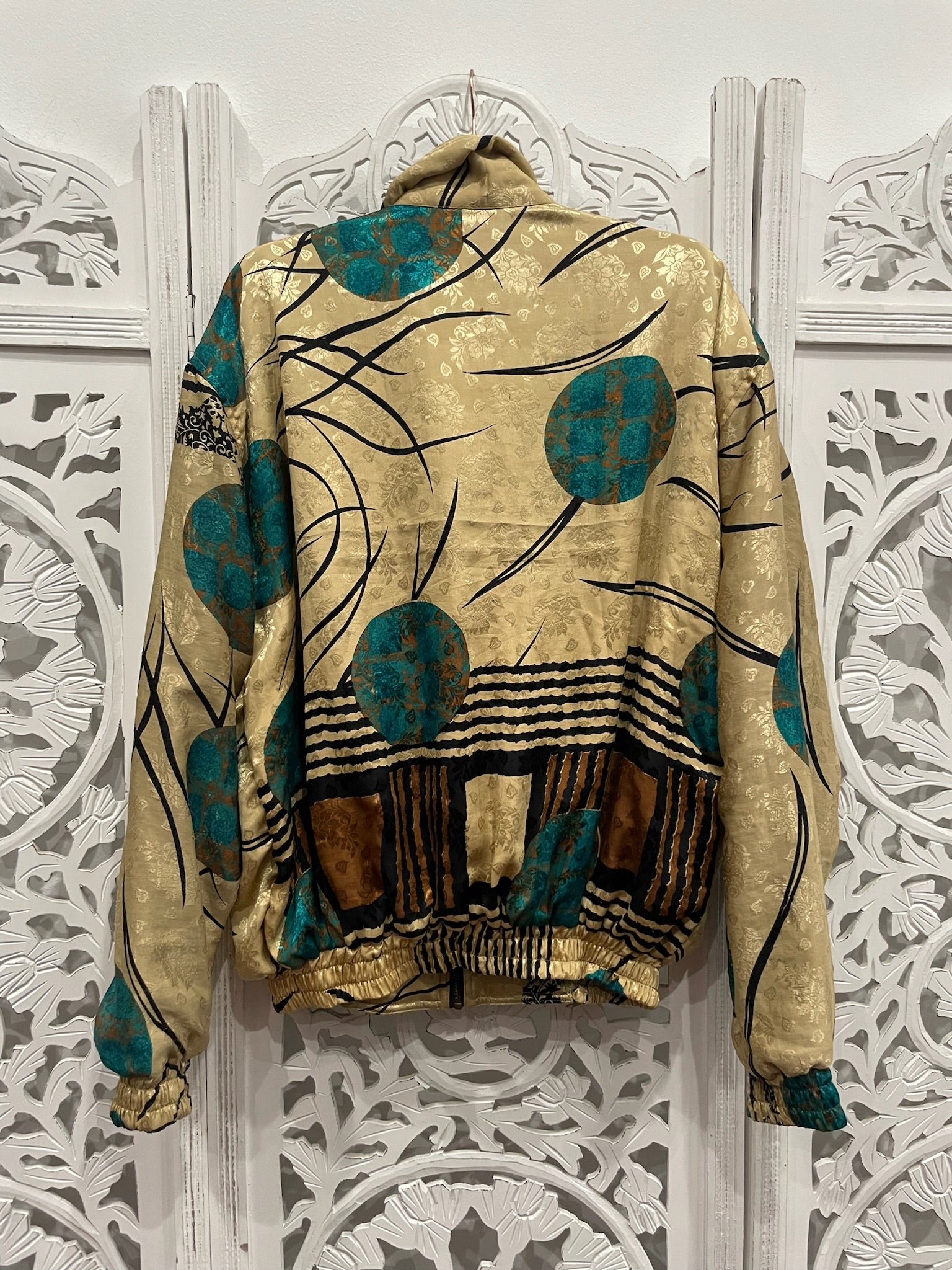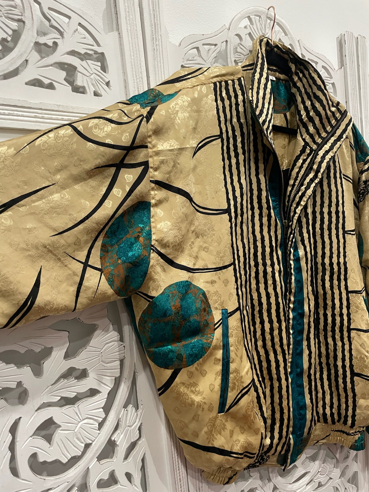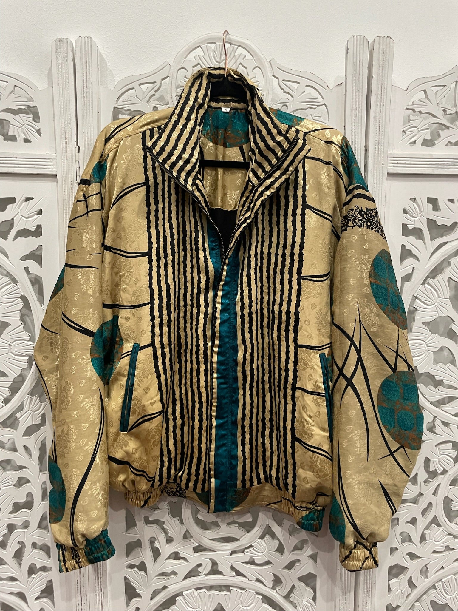 Each hooded bomber jacket flaunts an upcycled Indian sari, black cotton inner bodice lining, zipped inner stash pocket, two open outer pockets, and black cuffed waist and sleeves.