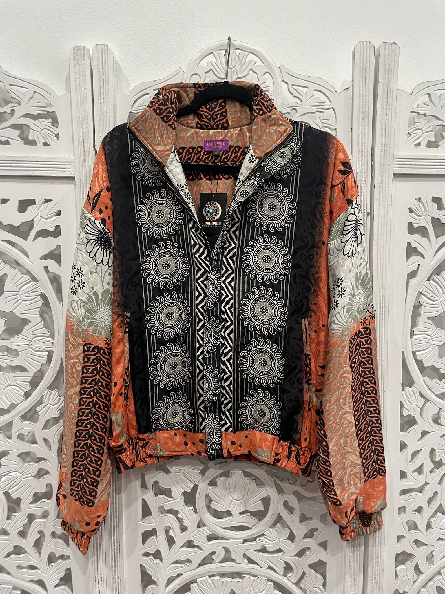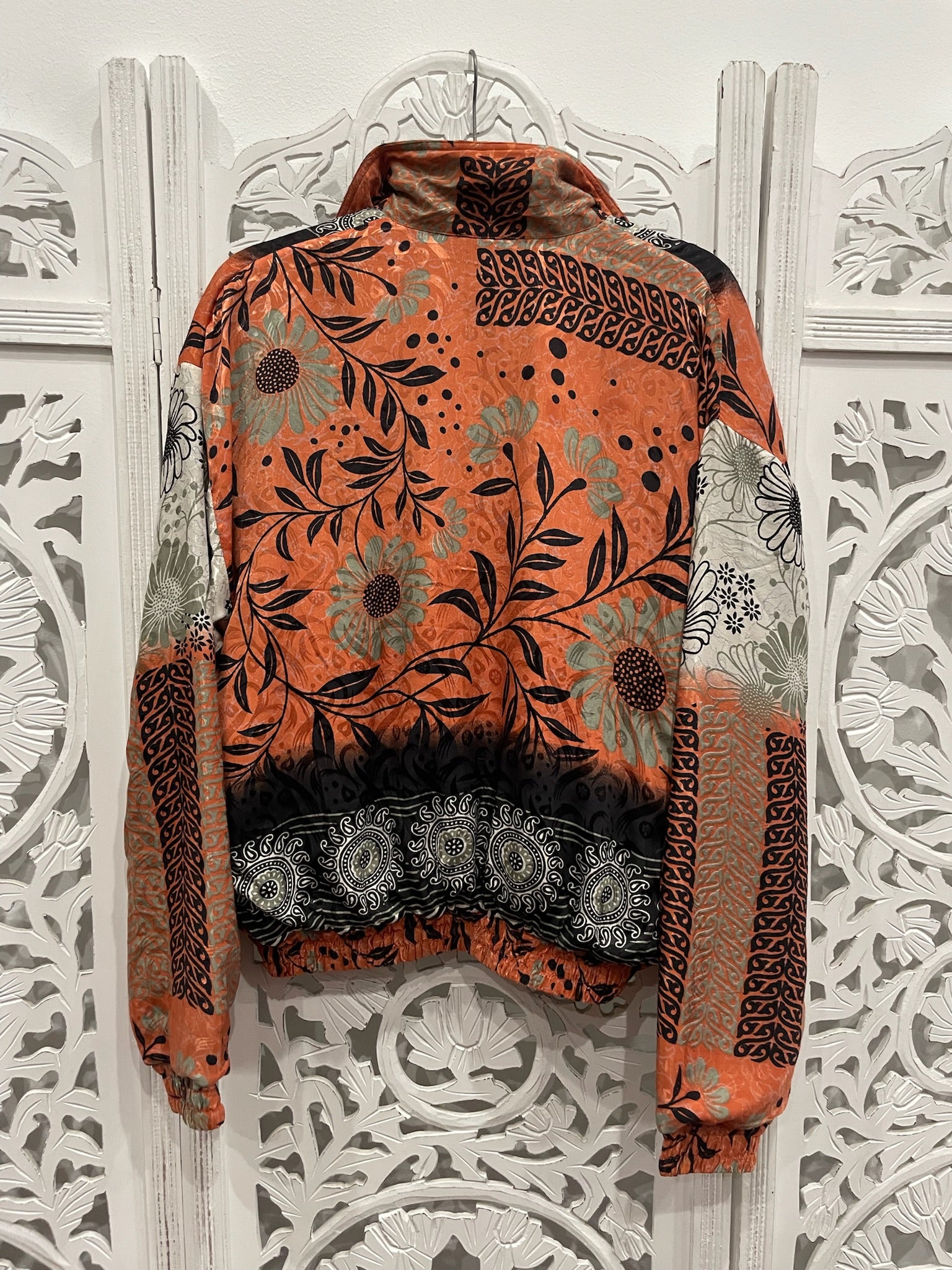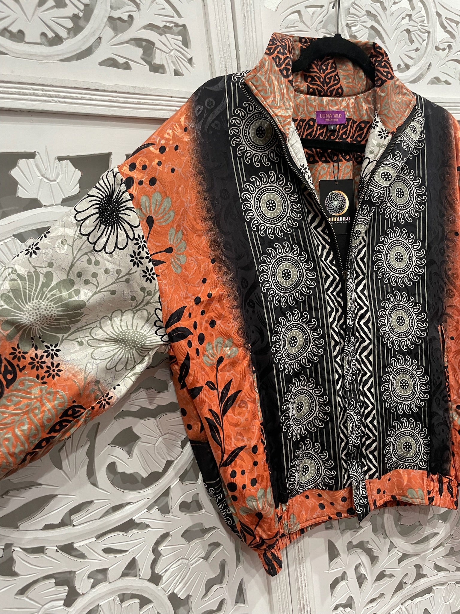 Each hooded bomber jacket flaunts an upcycled Indian sari, black cotton inner bodice lining, zipped inner stash pocket, two open outer pockets, and black cuffed waist and sleeves.