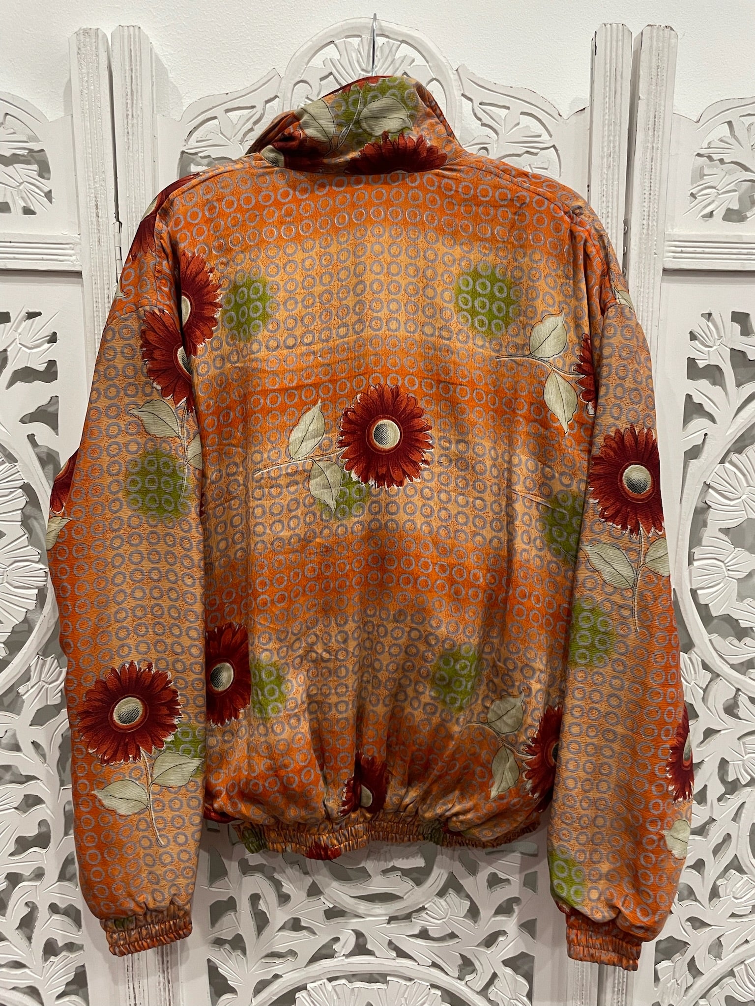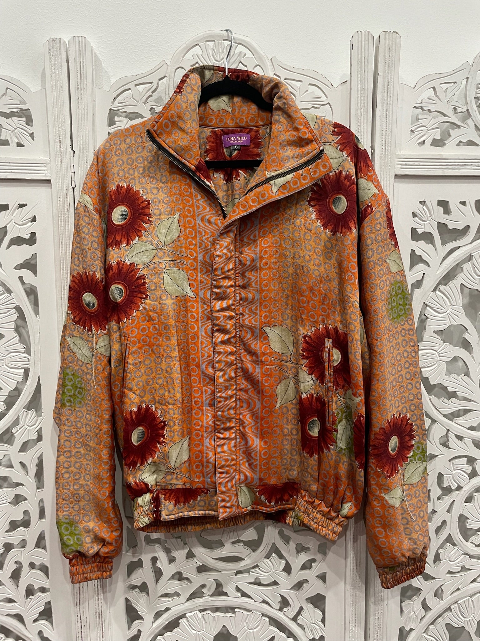 Each hooded bomber jacket flaunts an upcycled Indian sari, black cotton inner bodice lining, zipped inner stash pocket, two open outer pockets, and black cuffed waist and sleeves.