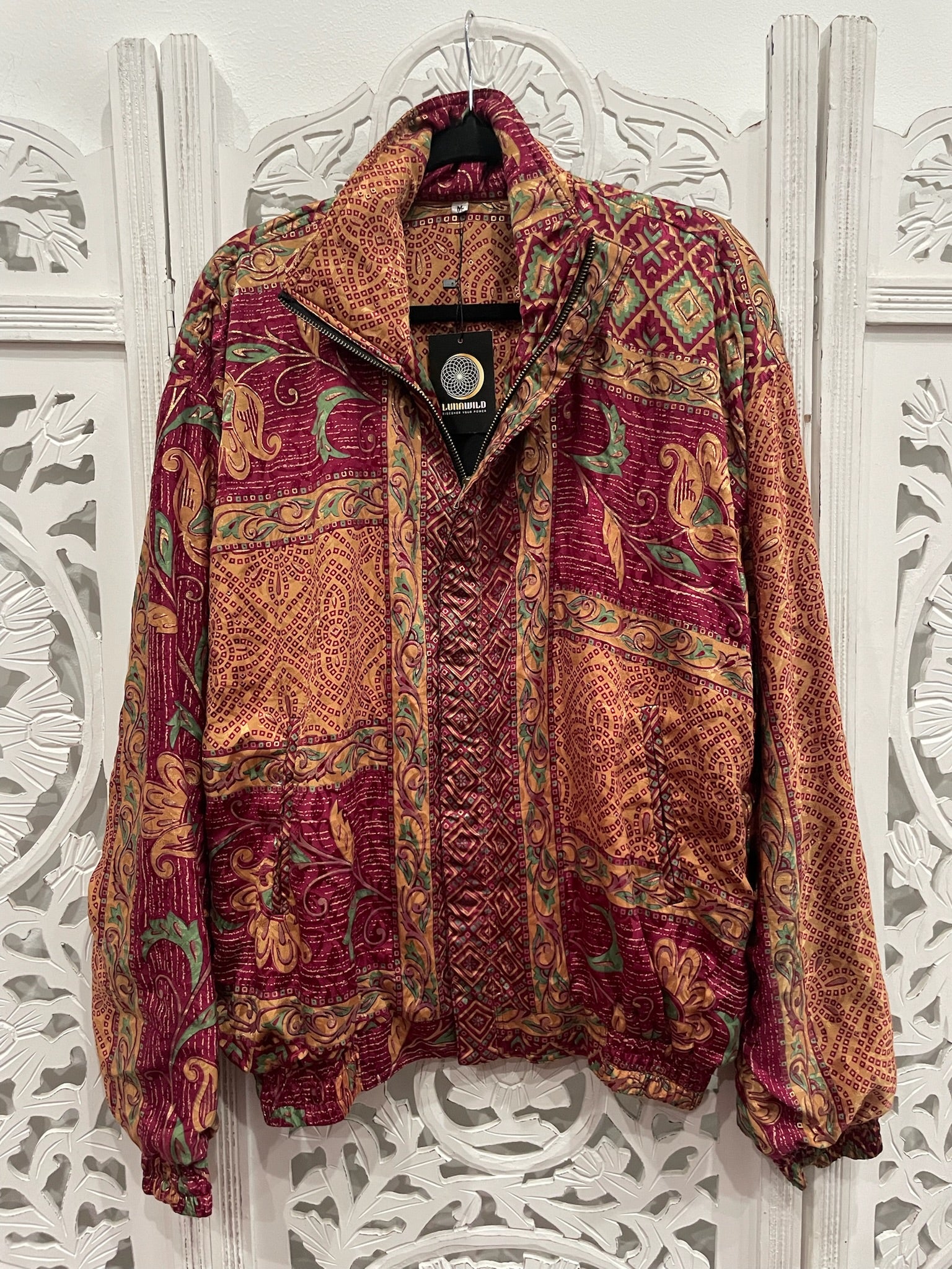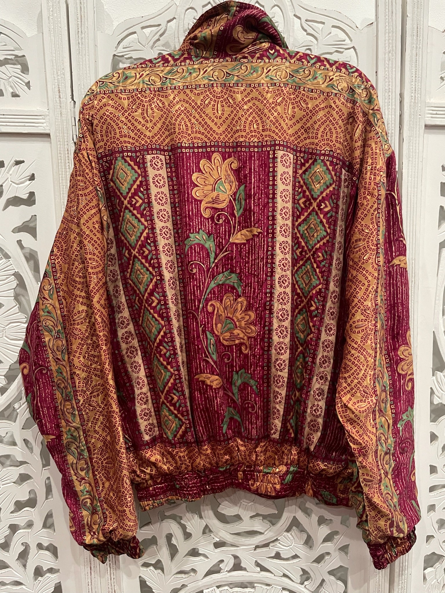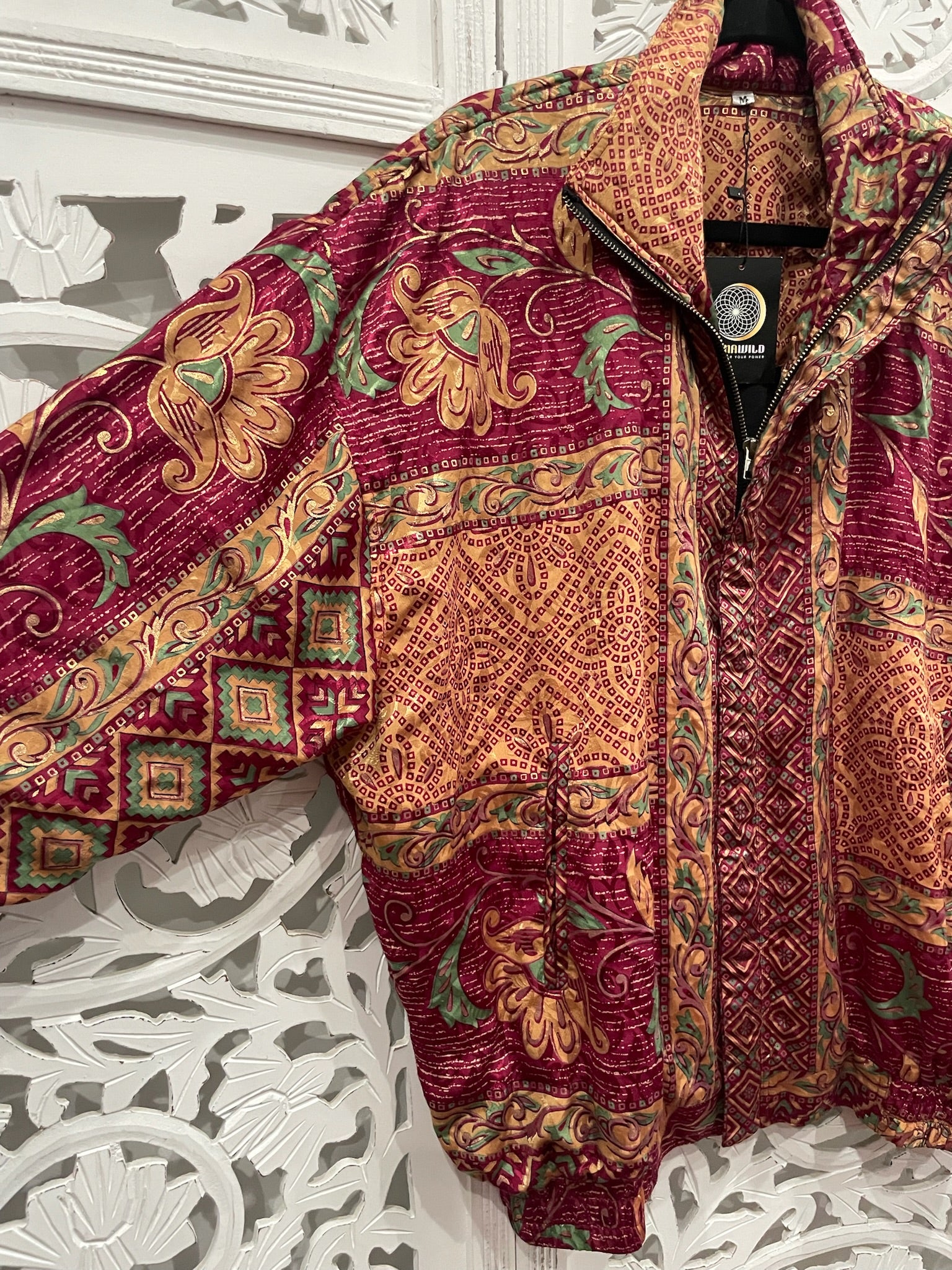 Each hooded bomber jacket flaunts an upcycled Indian sari, black cotton inner bodice lining, zipped inner stash pocket, two open outer pockets, and black cuffed waist and sleeves.