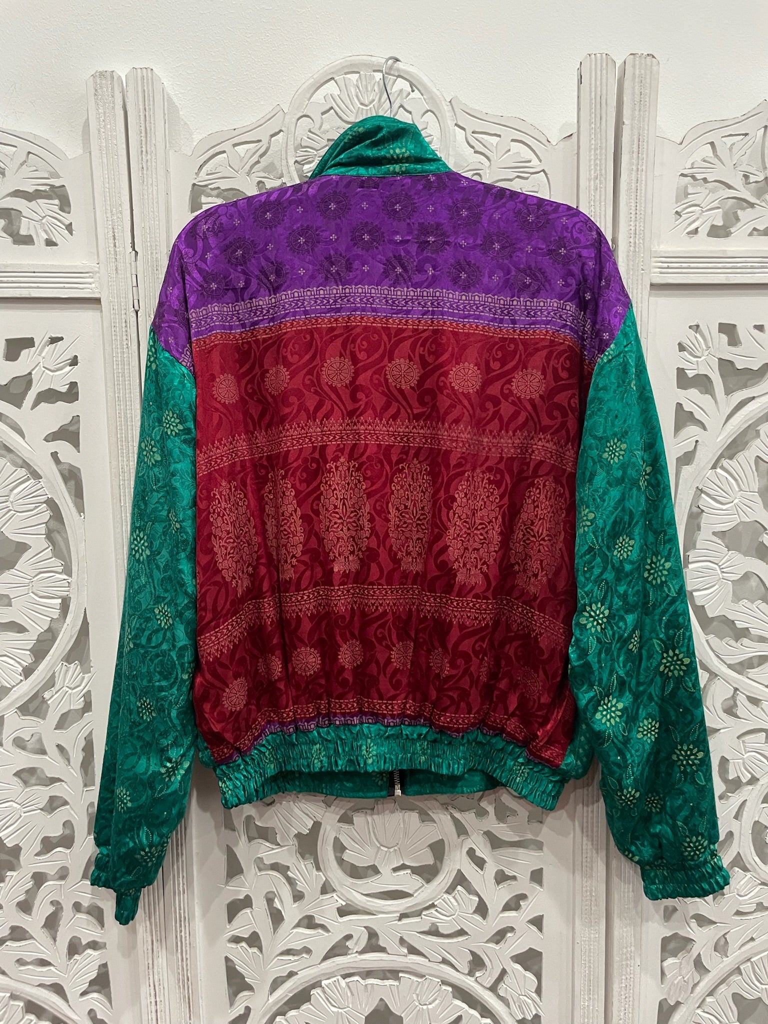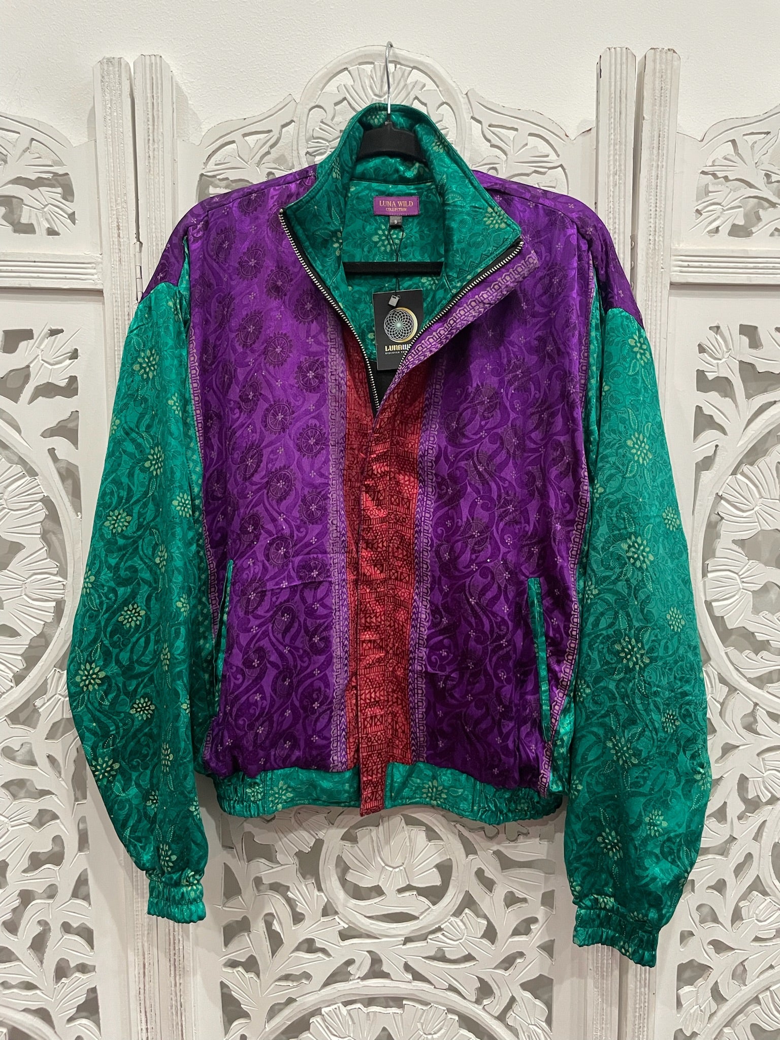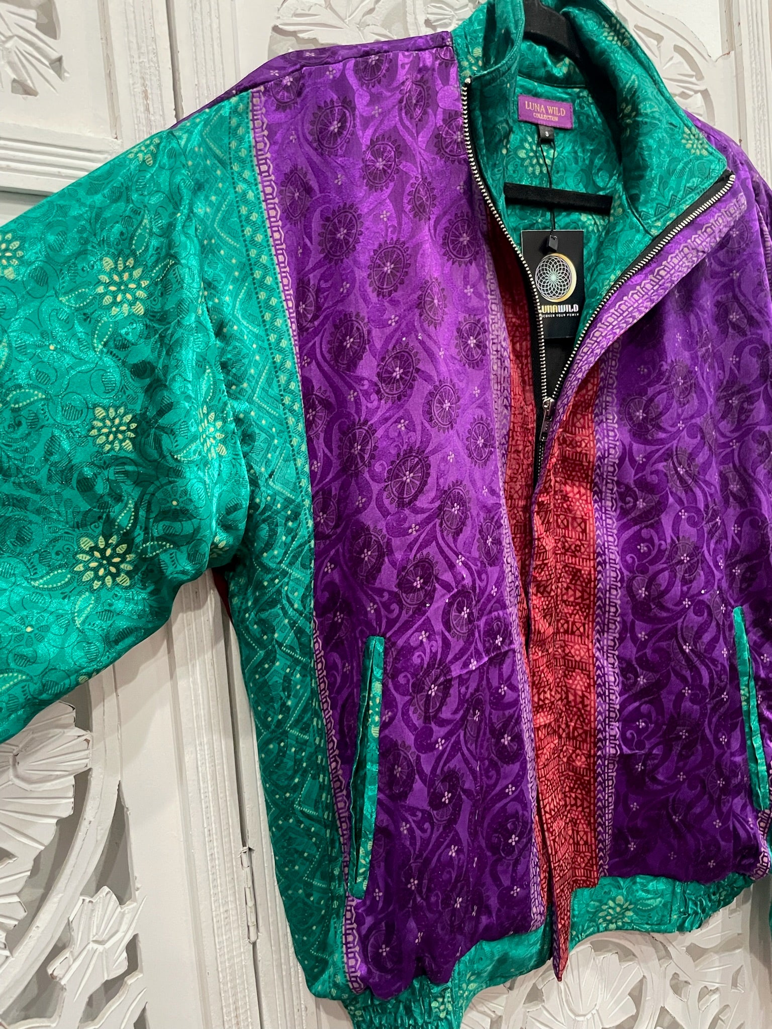 Each hooded bomber jacket flaunts an upcycled Indian sari, black cotton inner bodice lining, zipped inner stash pocket, two open outer pockets, and black cuffed waist and sleeves.
