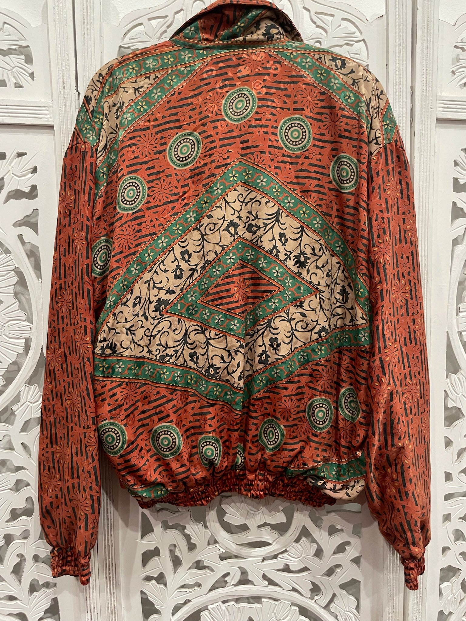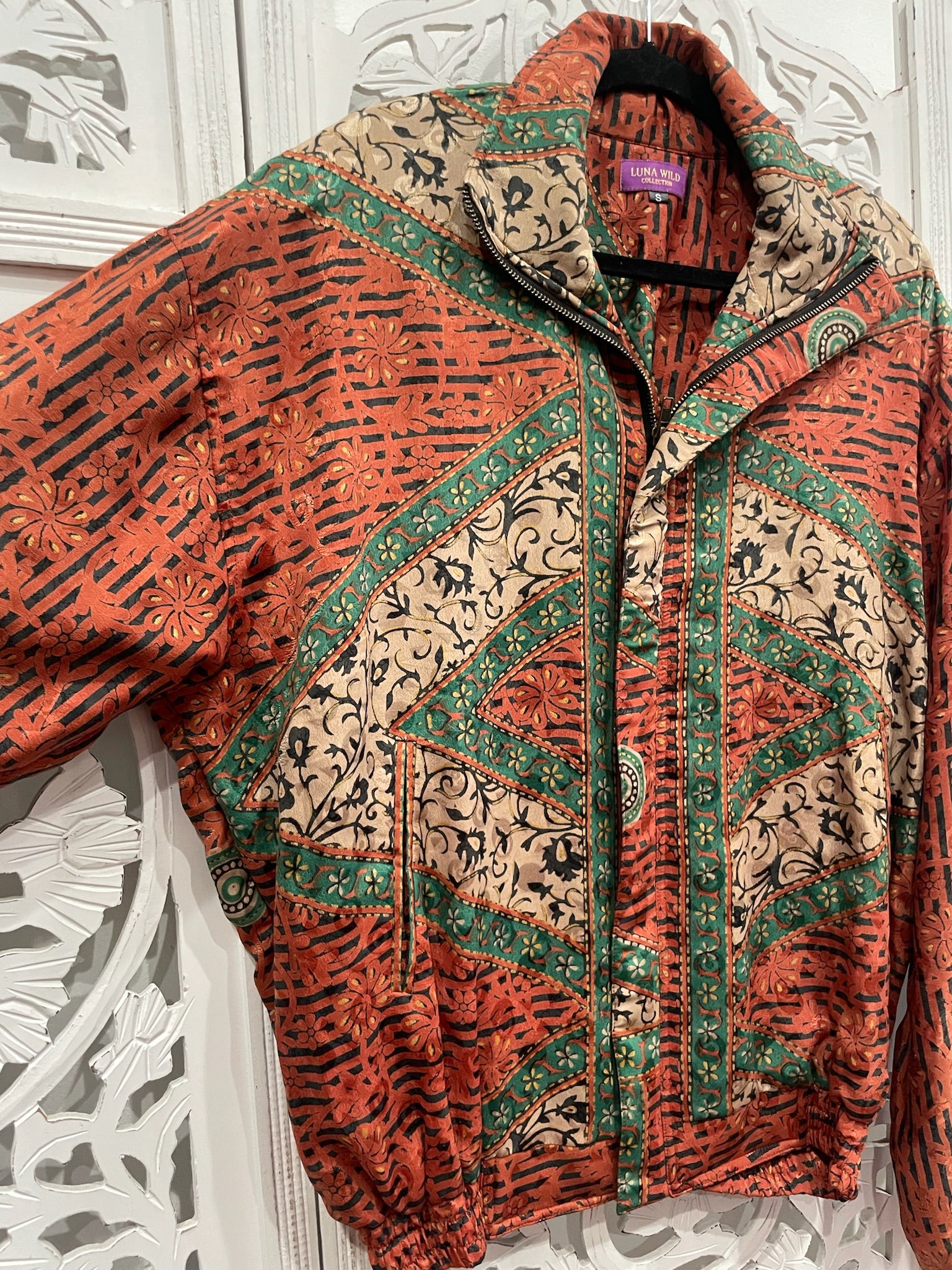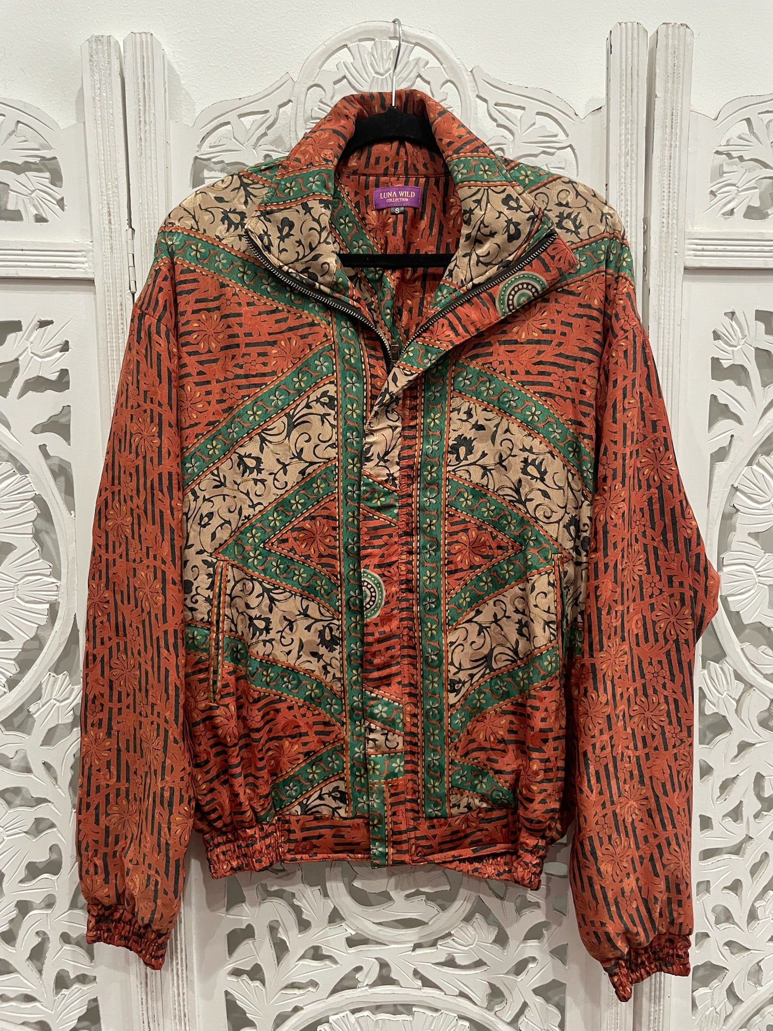 Each hooded bomber jacket flaunts an upcycled Indian sari, black cotton inner bodice lining, zipped inner stash pocket, two open outer pockets, and black cuffed waist and sleeves.