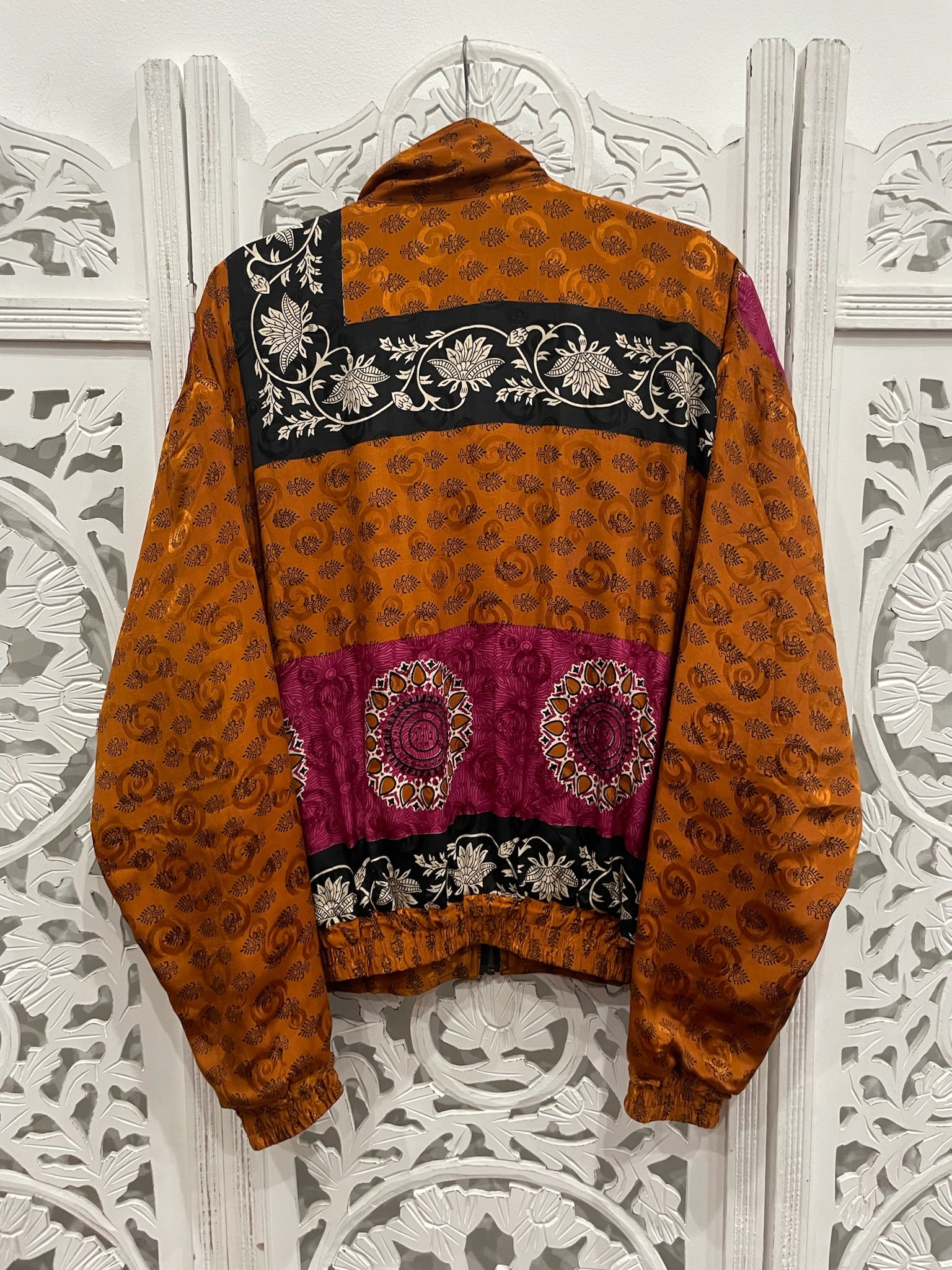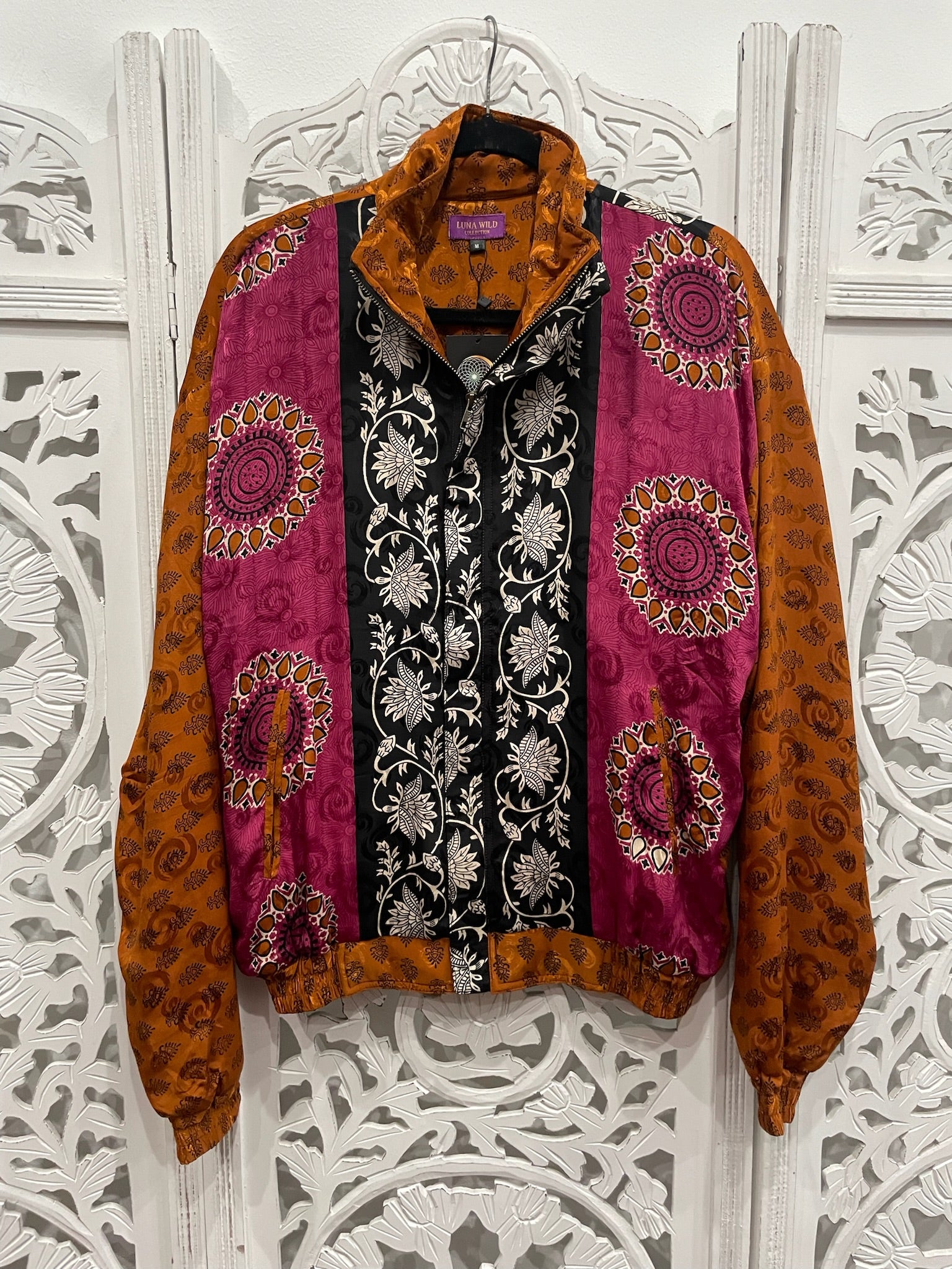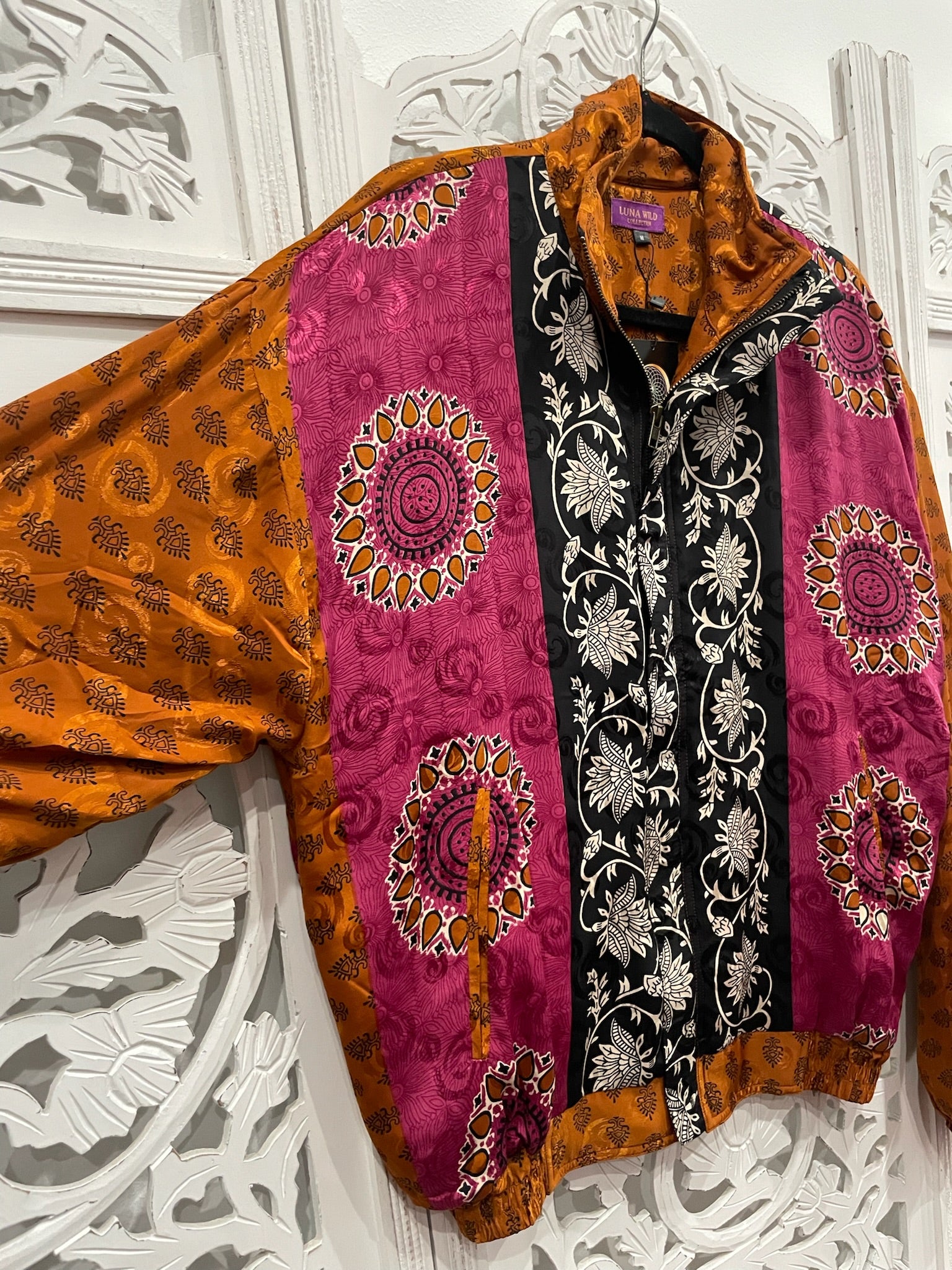 Each hooded bomber jacket flaunts an upcycled Indian sari, black cotton inner bodice lining, zipped inner stash pocket, two open outer pockets, and black cuffed waist and sleeves.