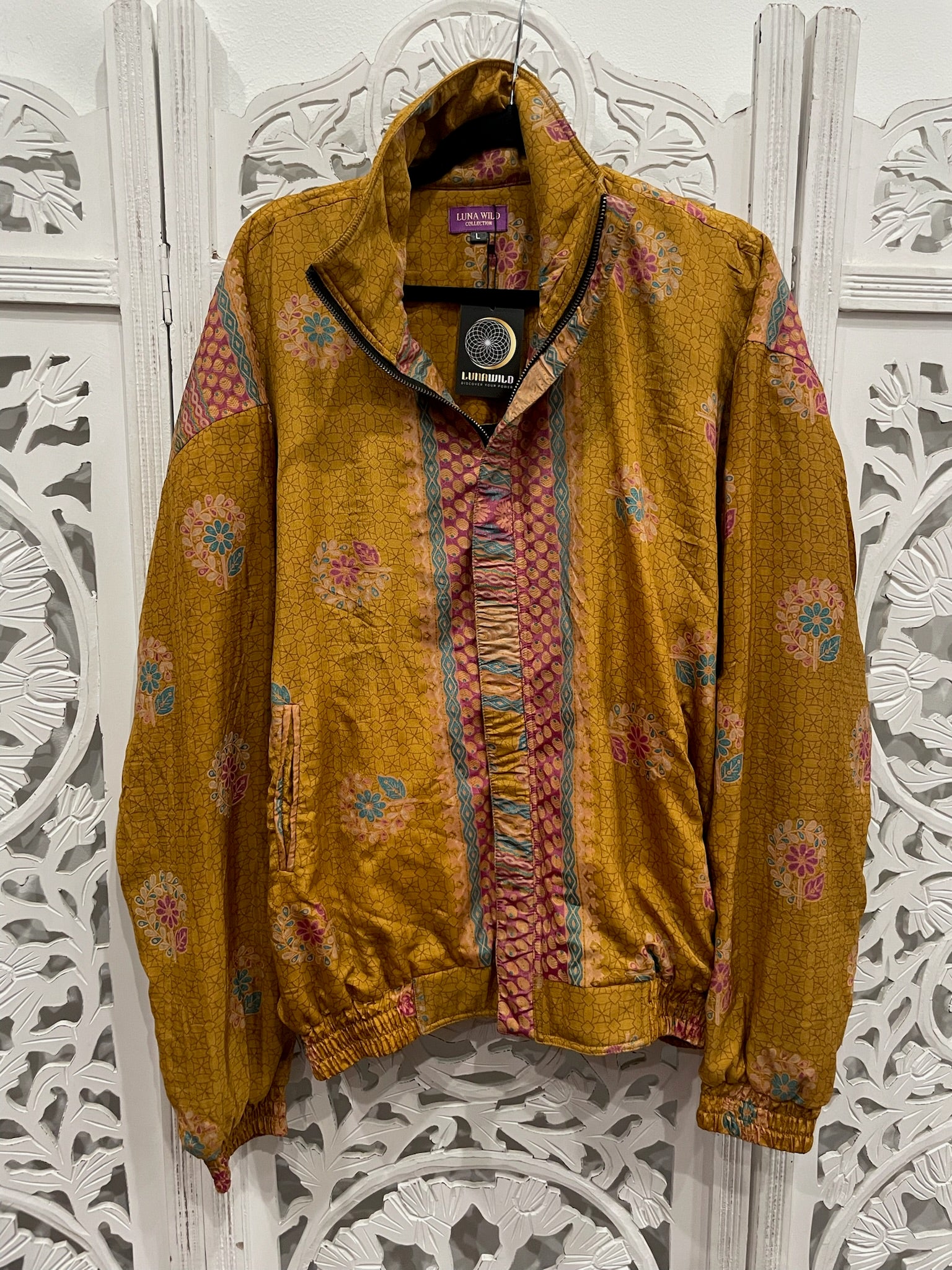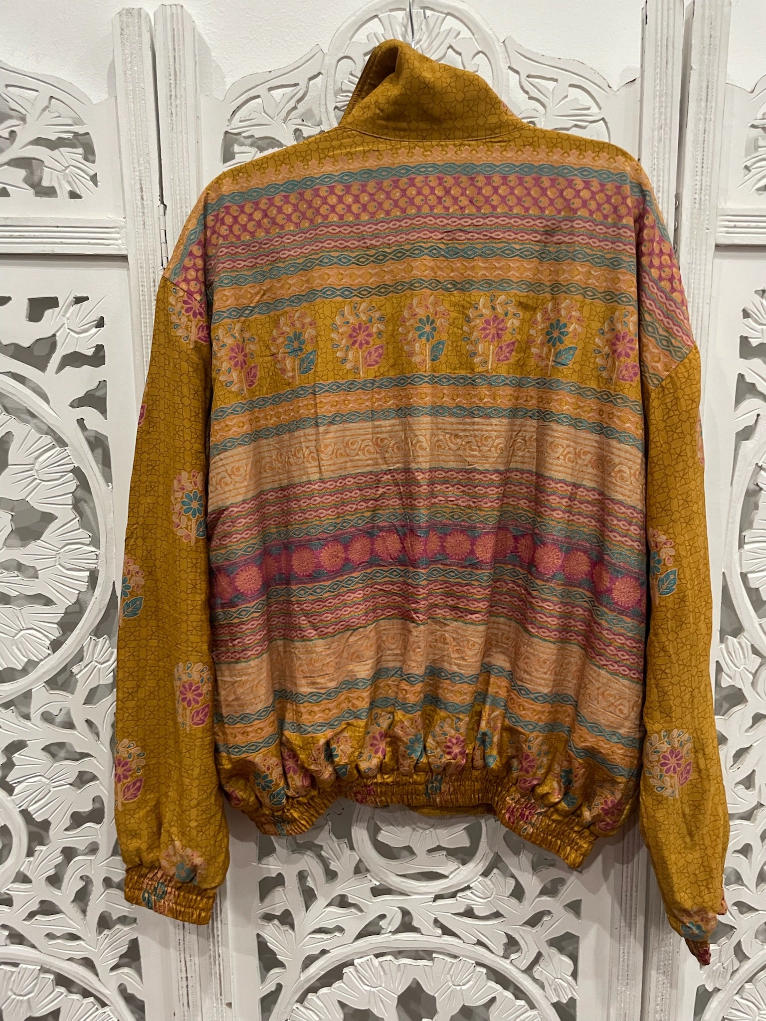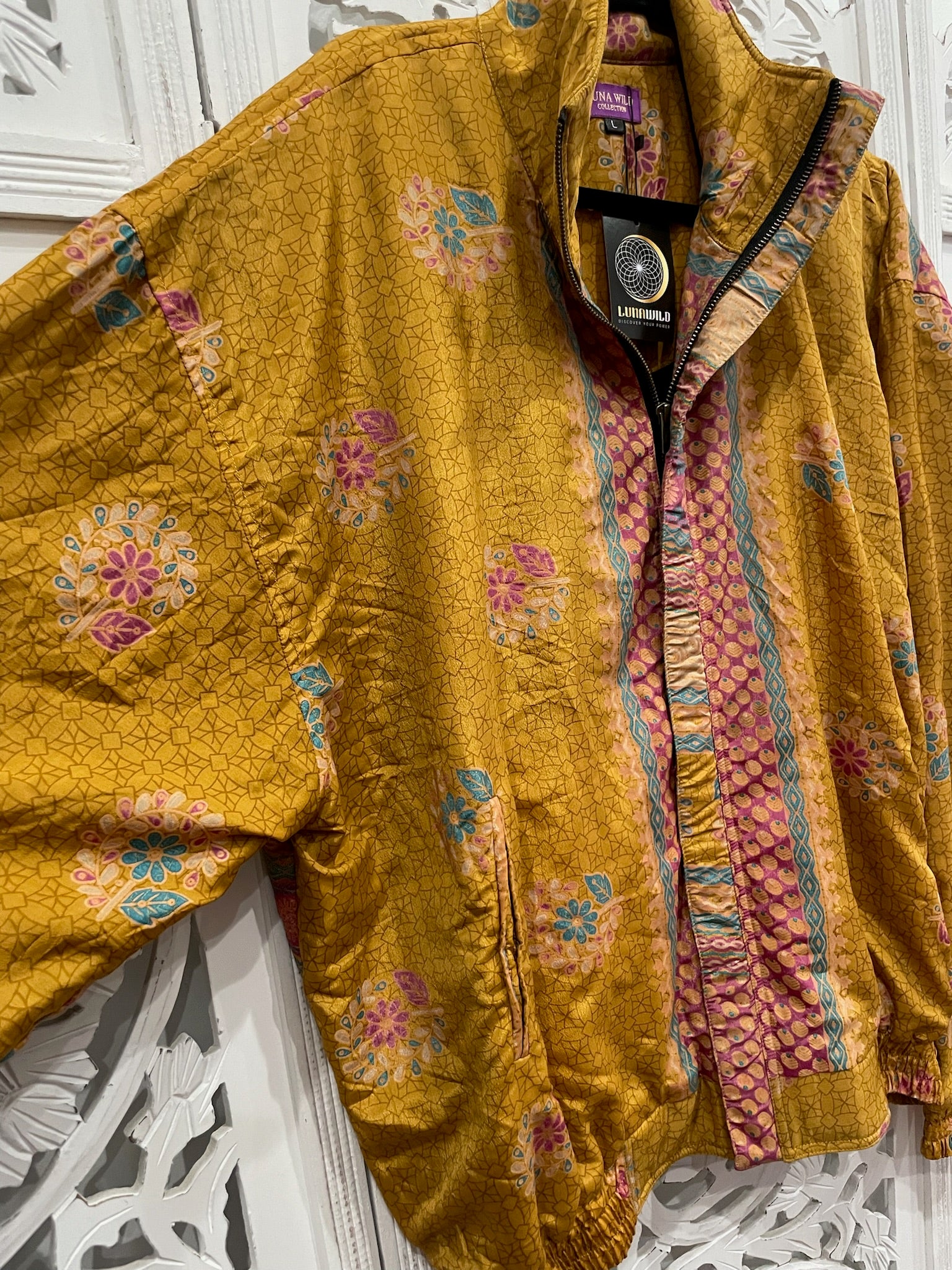 Each hooded bomber jacket flaunts an upcycled Indian sari, black cotton inner bodice lining, zipped inner stash pocket, two open outer pockets, and black cuffed waist and sleeves.
