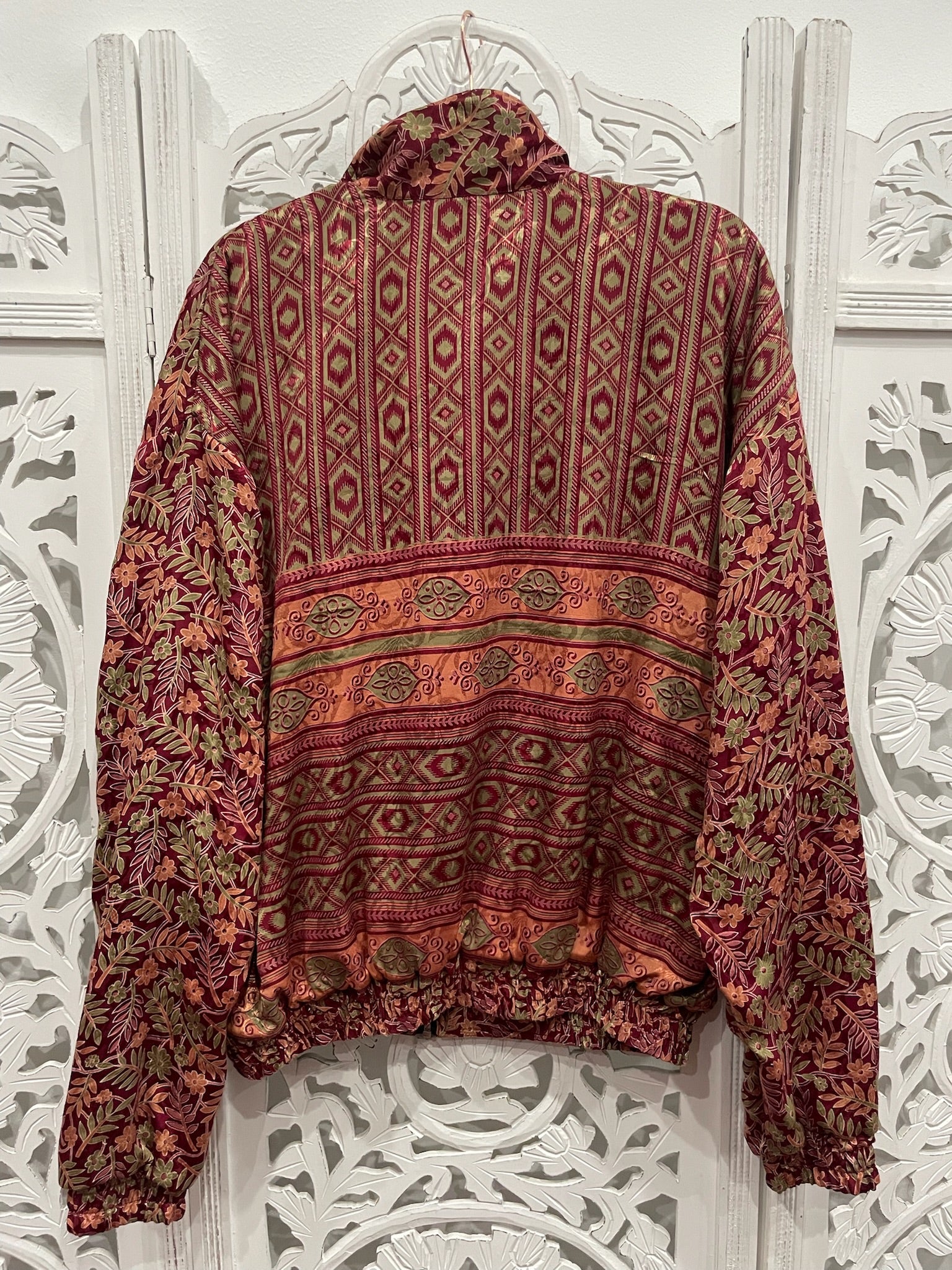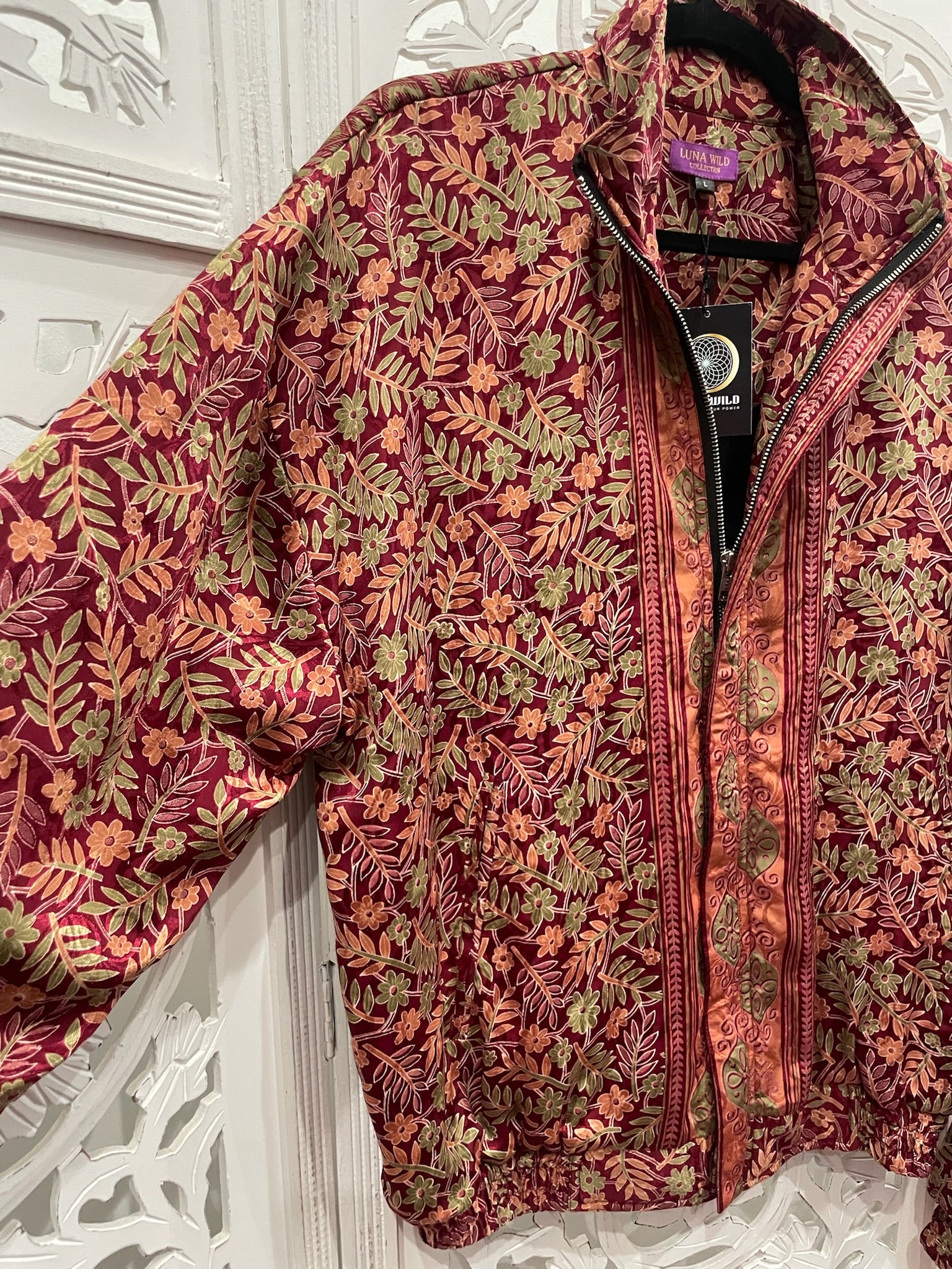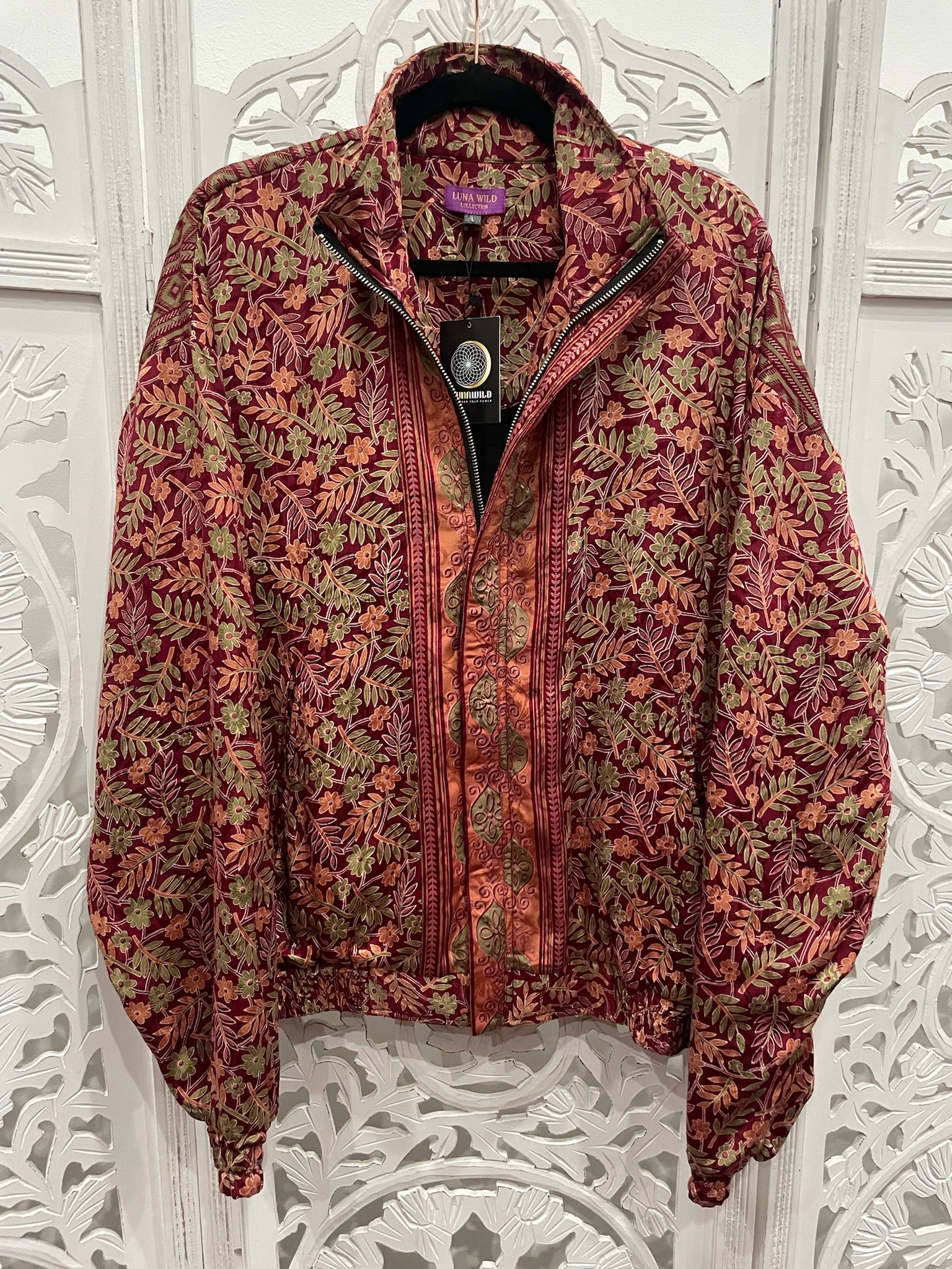Each hooded bomber jacket flaunts an upcycled Indian sari, black cotton inner bodice lining, zipped inner stash pocket, two open outer pockets, and black cuffed waist and sleeves.