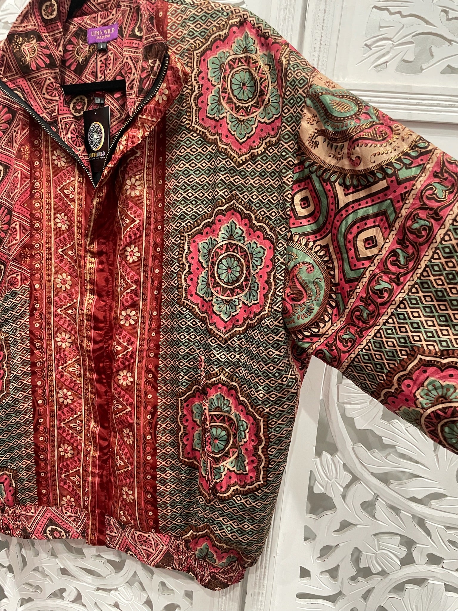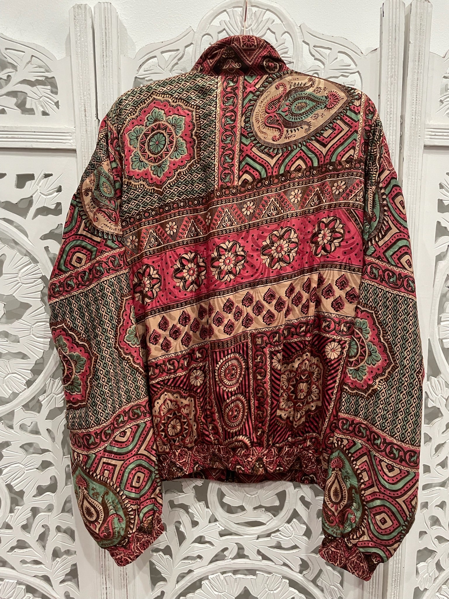 Each hooded bomber jacket flaunts an upcycled Indian sari, black cotton inner bodice lining, zipped inner stash pocket, two open outer pockets, and black cuffed waist and sleeves.