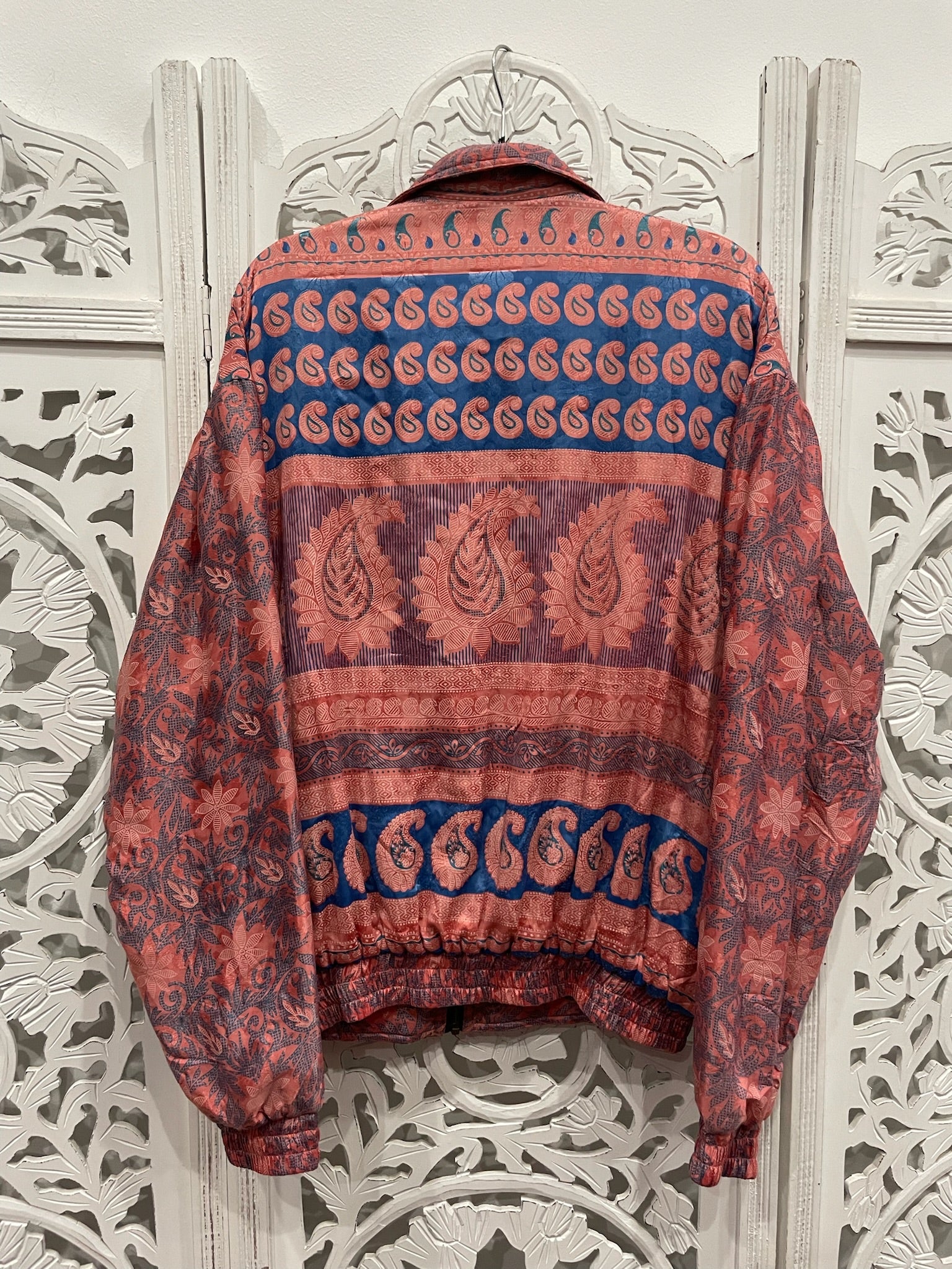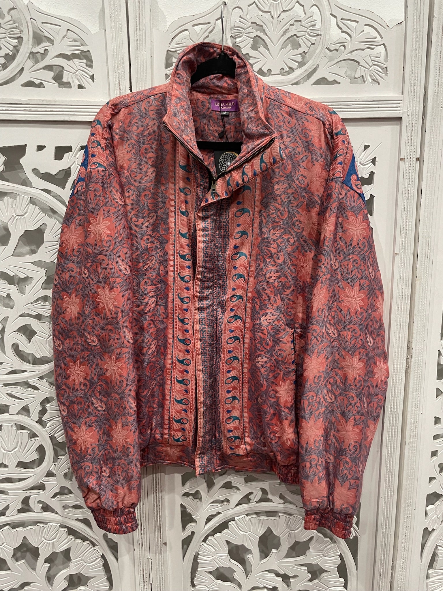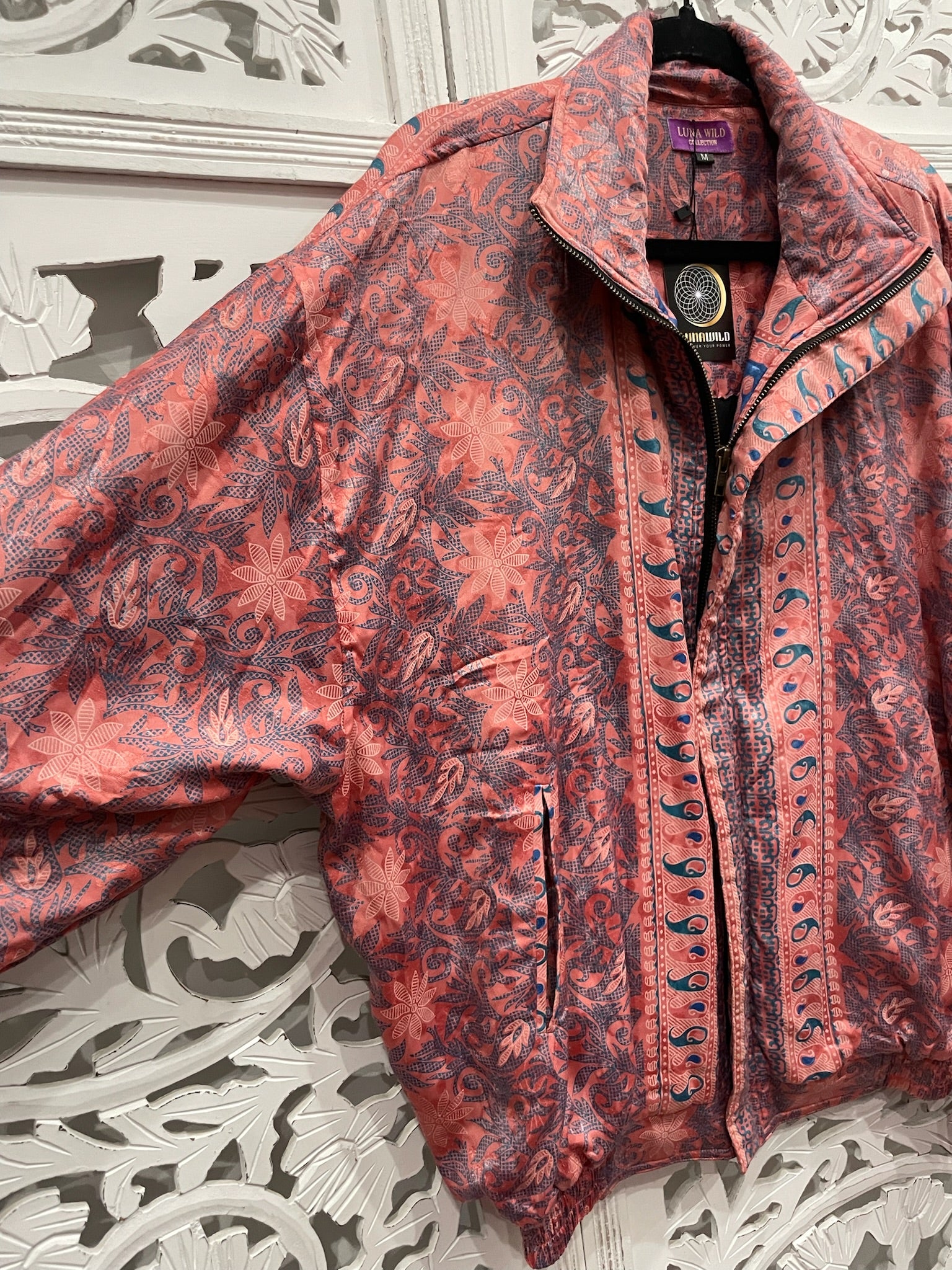 Each hooded bomber jacket flaunts an upcycled Indian sari, black cotton inner bodice lining, zipped inner stash pocket, two open outer pockets, and black cuffed waist and sleeves.