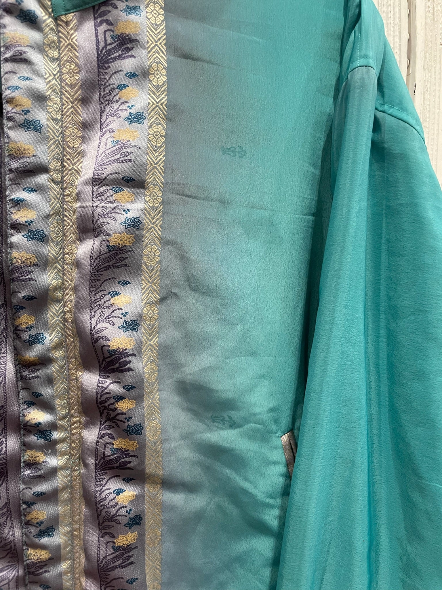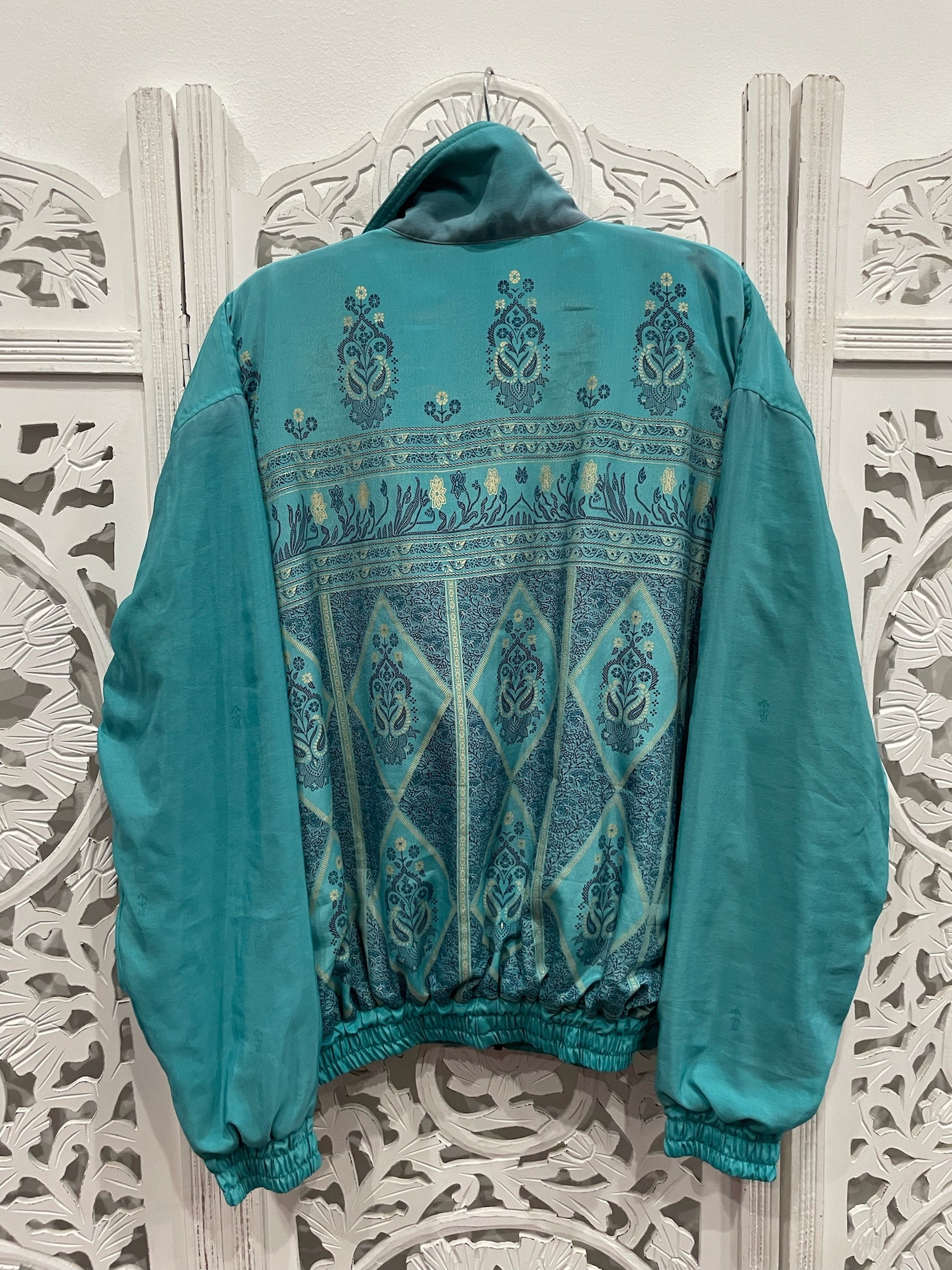 Each hooded bomber jacket flaunts an upcycled Indian sari, black cotton inner bodice lining, zipped inner stash pocket, two open outer pockets, and black cuffed waist and sleeves.