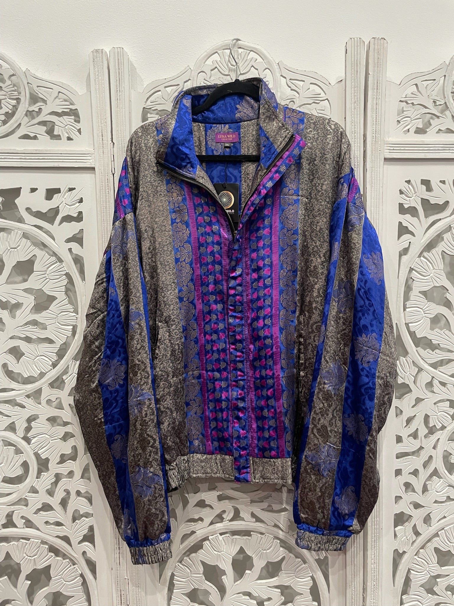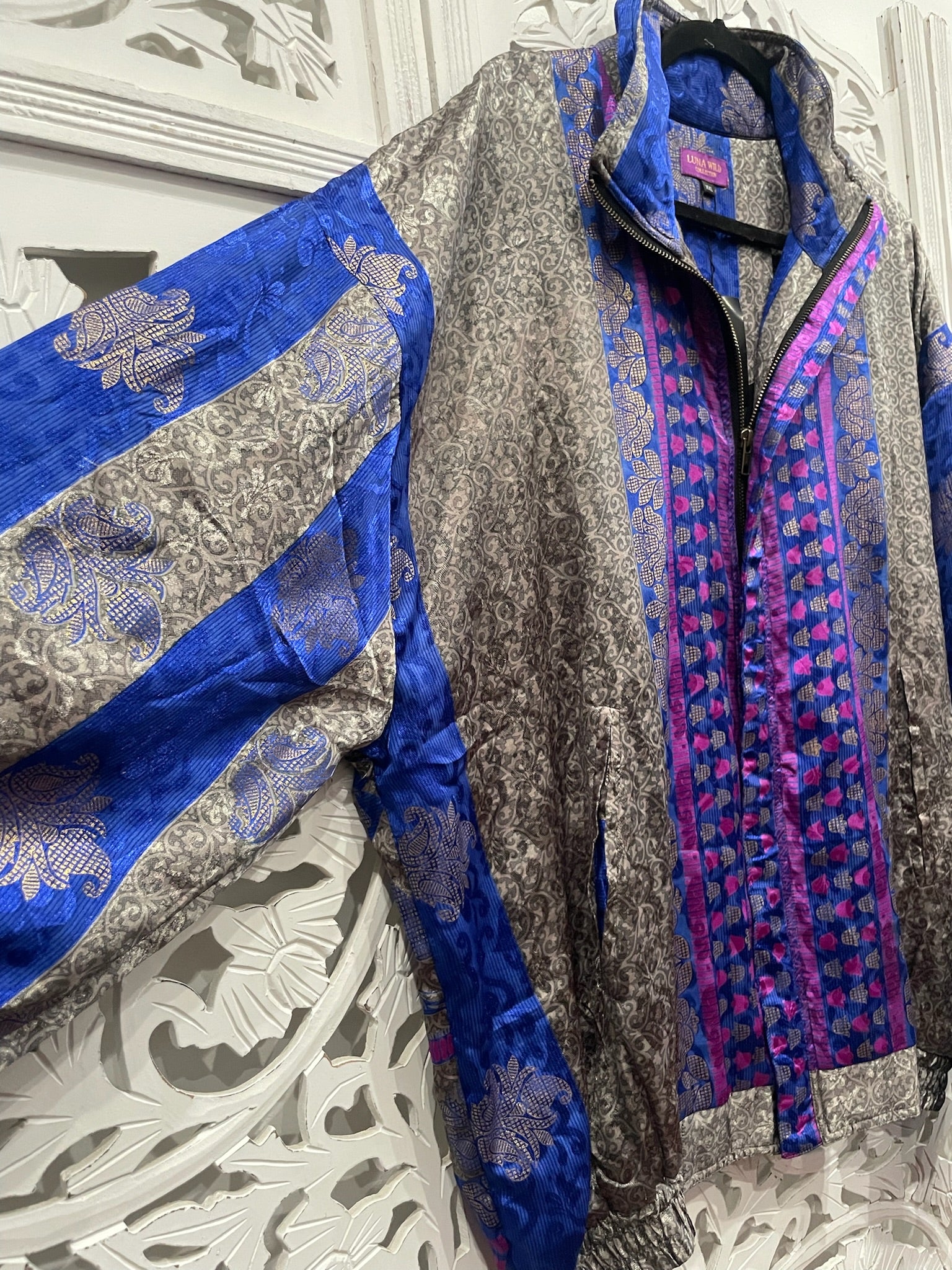 Each hooded bomber jacket flaunts an upcycled Indian sari, black cotton inner bodice lining, zipped inner stash pocket, two open outer pockets, and black cuffed waist and sleeves.