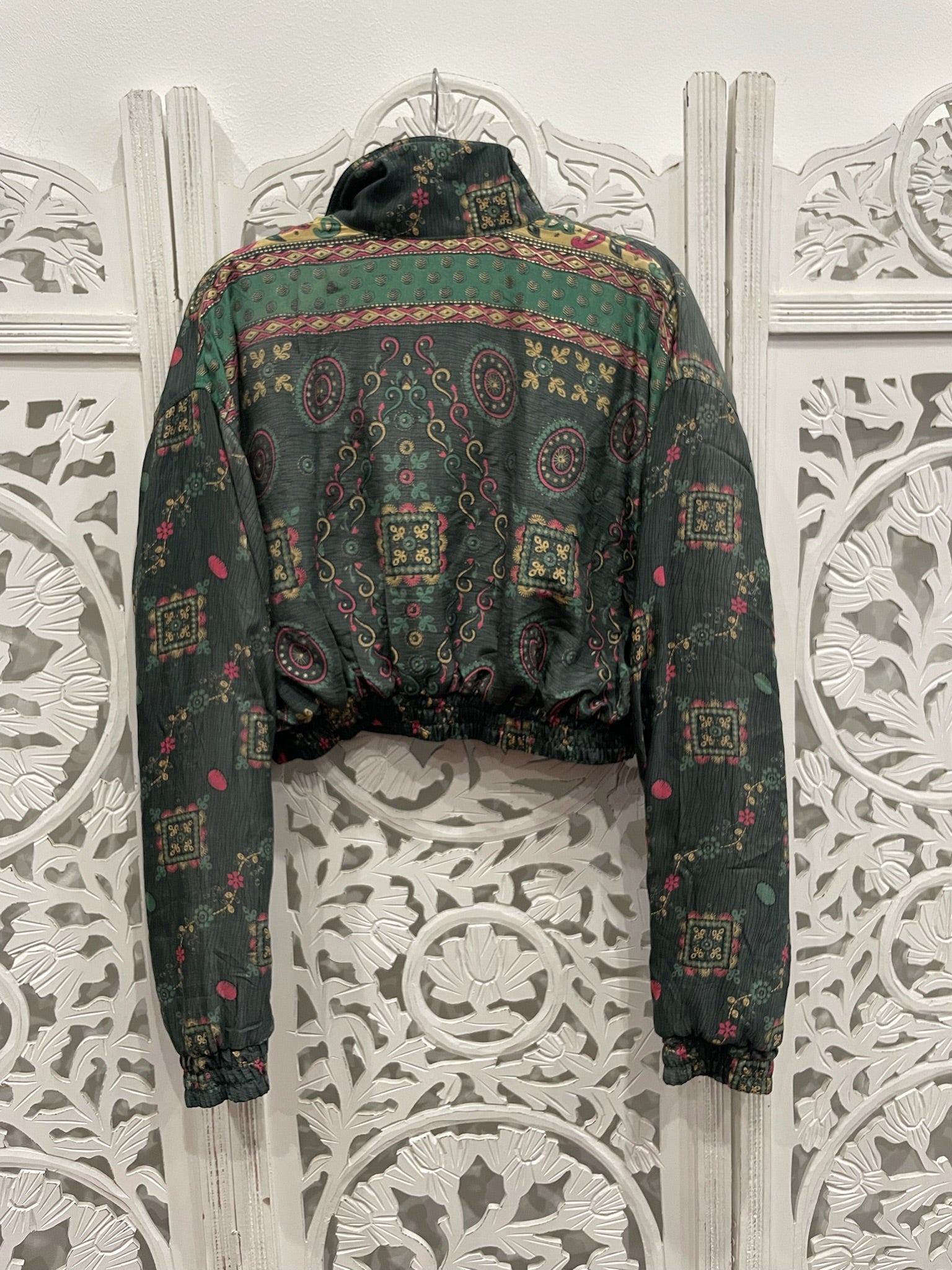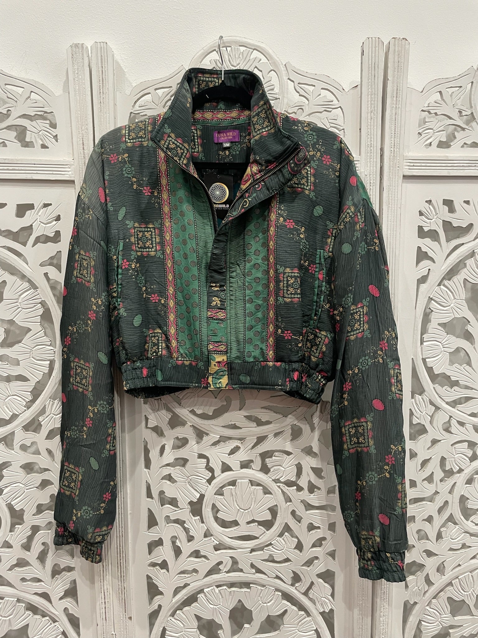 Each cropped bomber jacket flaunts an upcycled Indian sari, black cotton inner bodice lining, zipped inner stash pocket, two open outer pockets, and a cropped cuffed waist and sleeves.