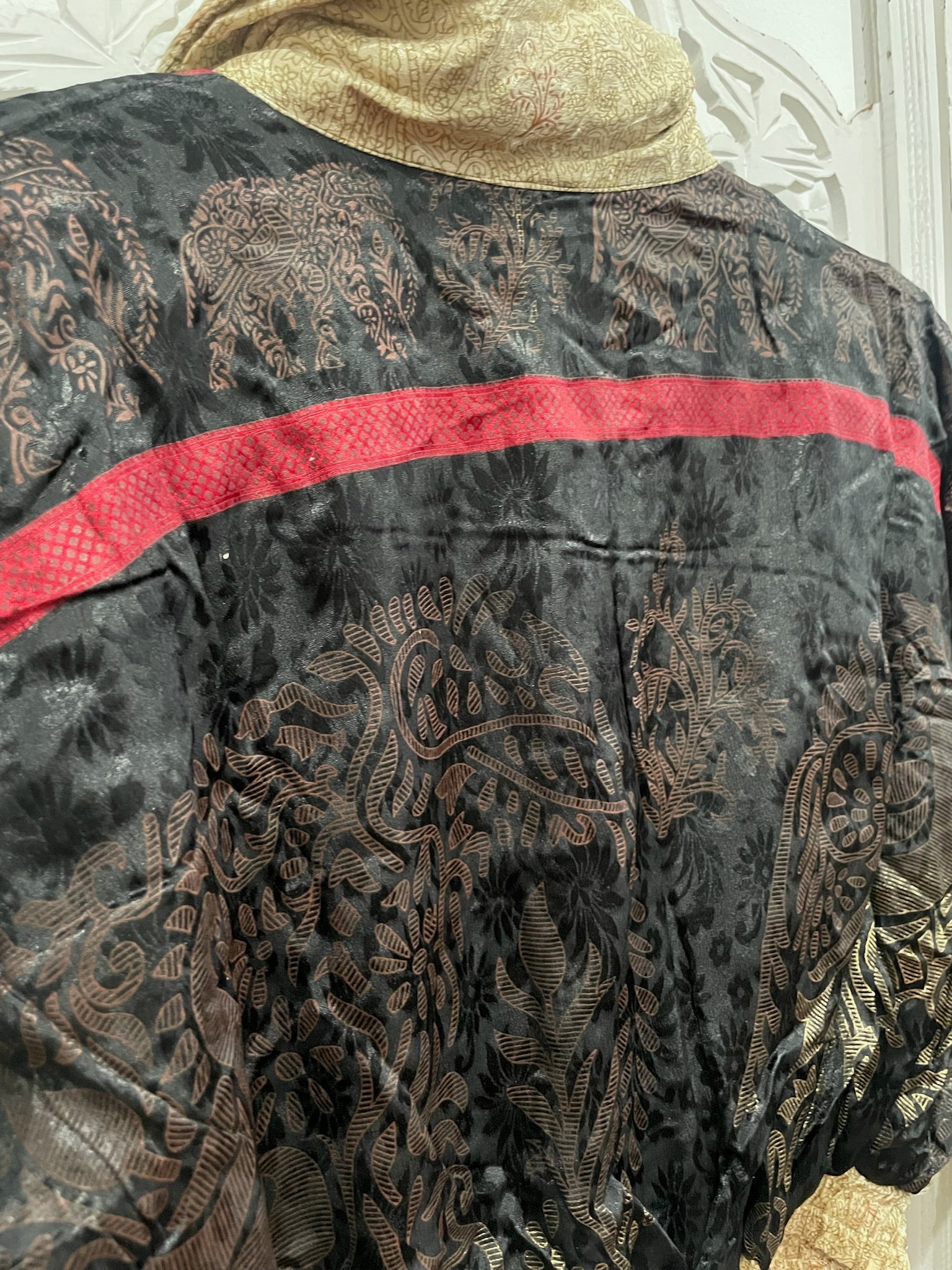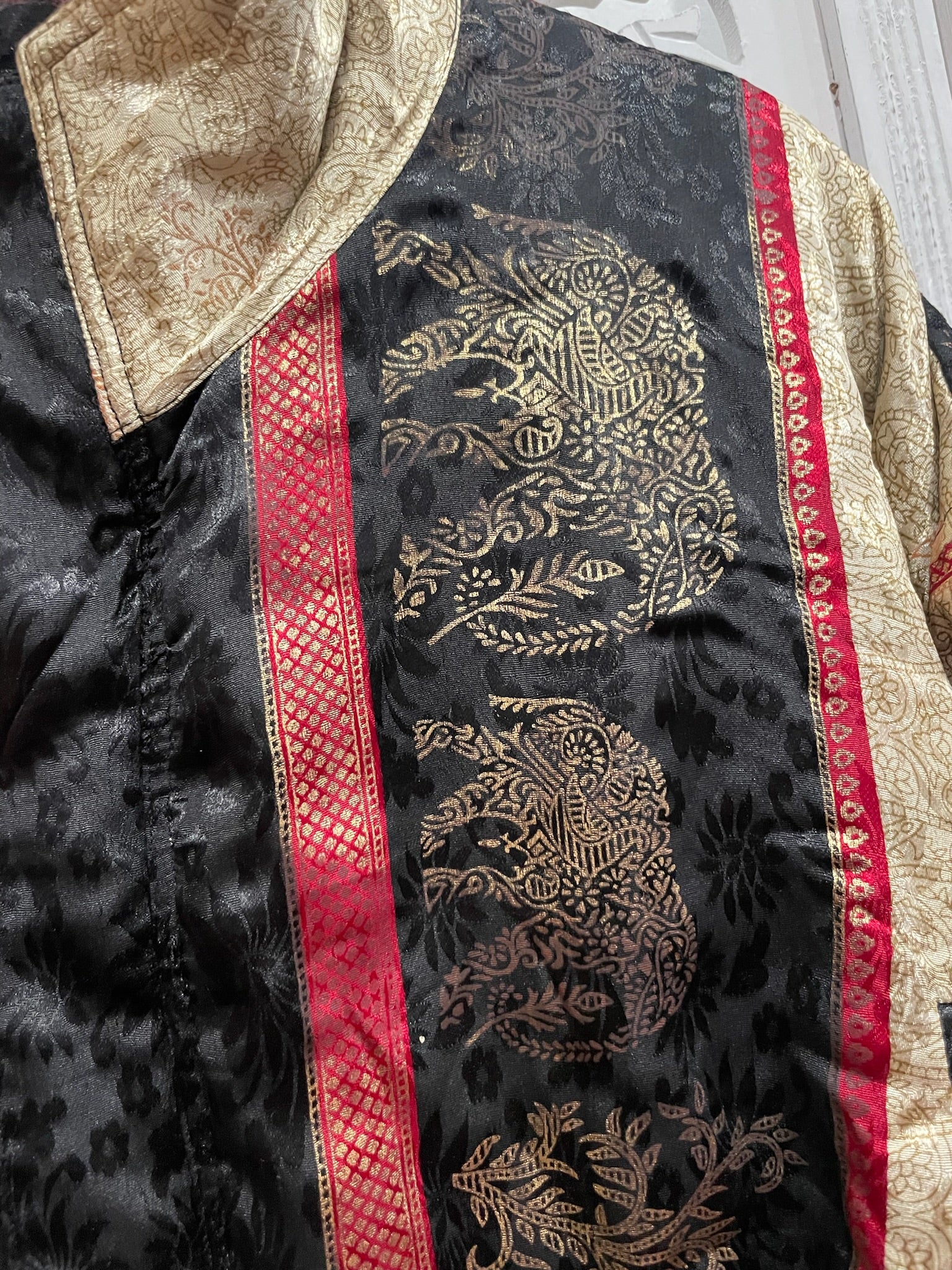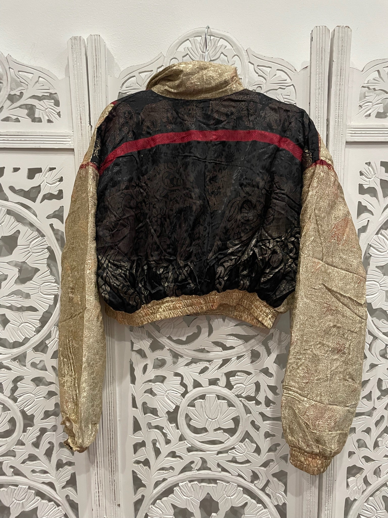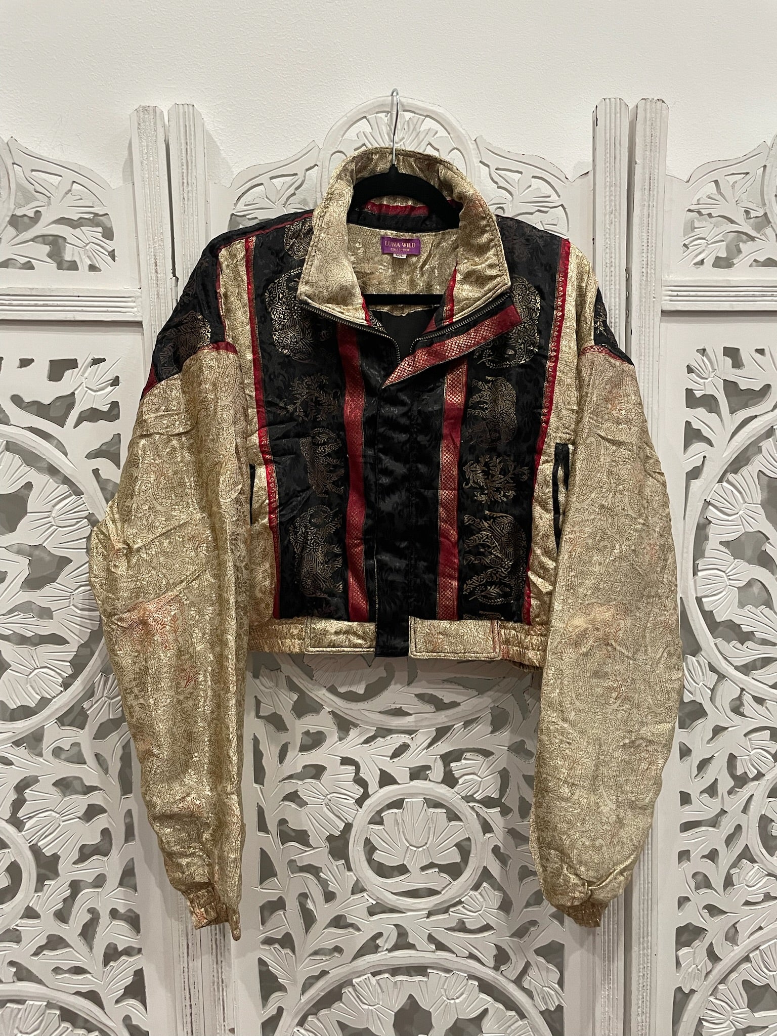 Each cropped bomber jacket flaunts an upcycled Indian sari, black cotton inner bodice lining, zipped inner stash pocket, two open outer pockets, and a cropped cuffed waist and sleeves.