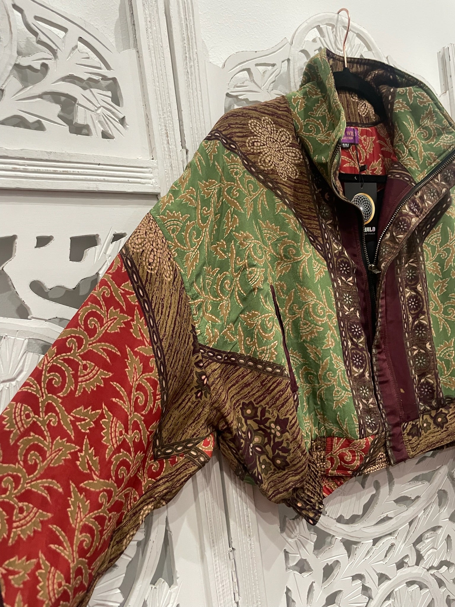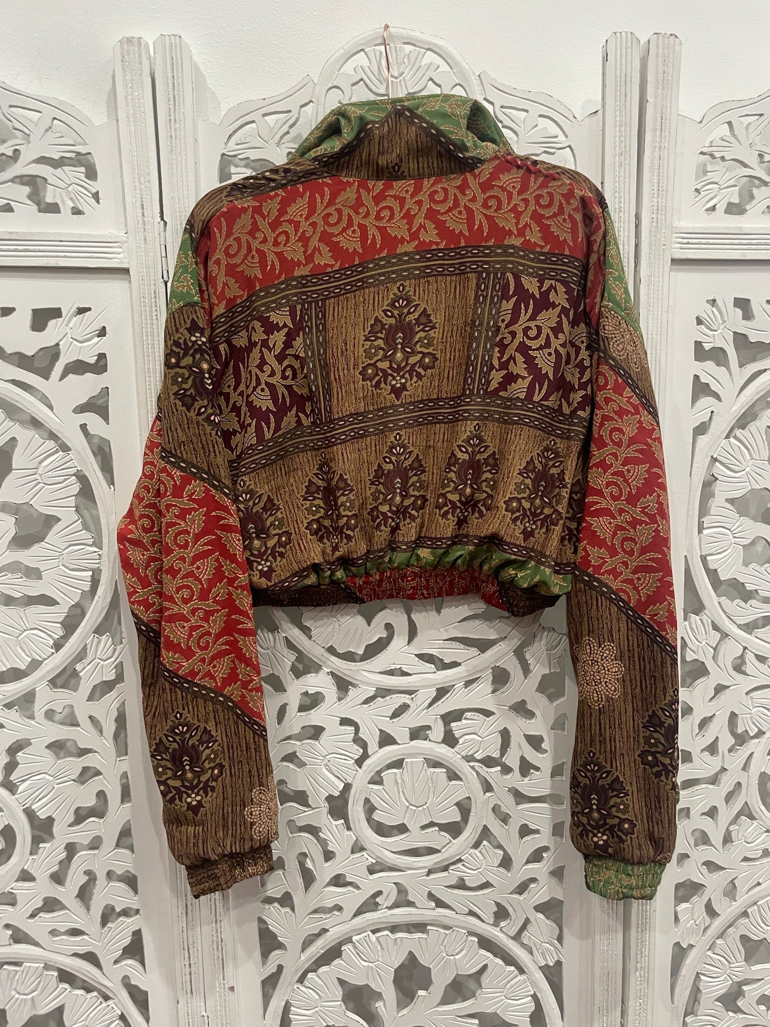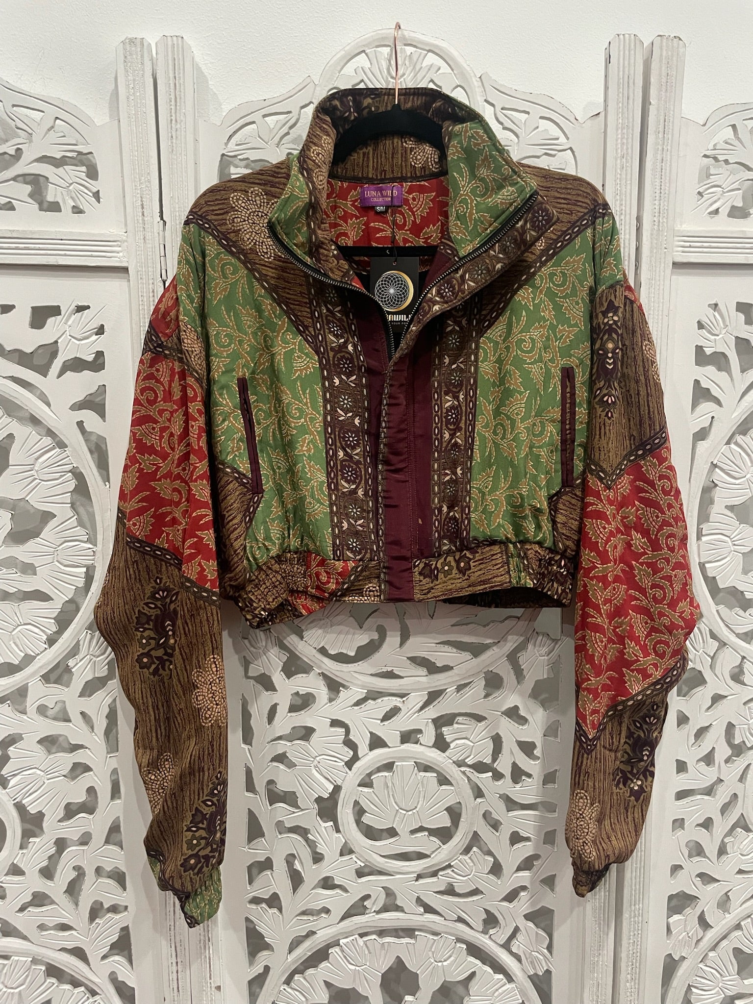 Each cropped bomber jacket flaunts an upcycled Indian sari, black cotton inner bodice lining, zipped inner stash pocket, two open outer pockets, and a cropped cuffed waist and sleeves.