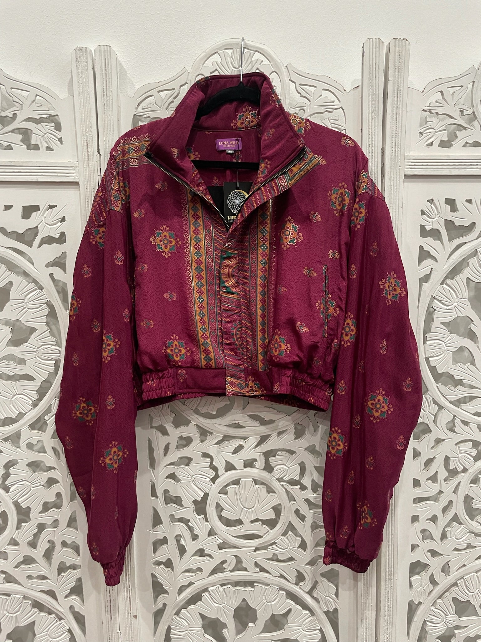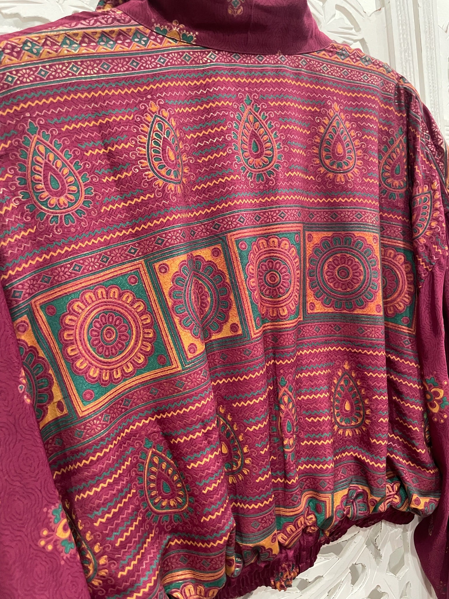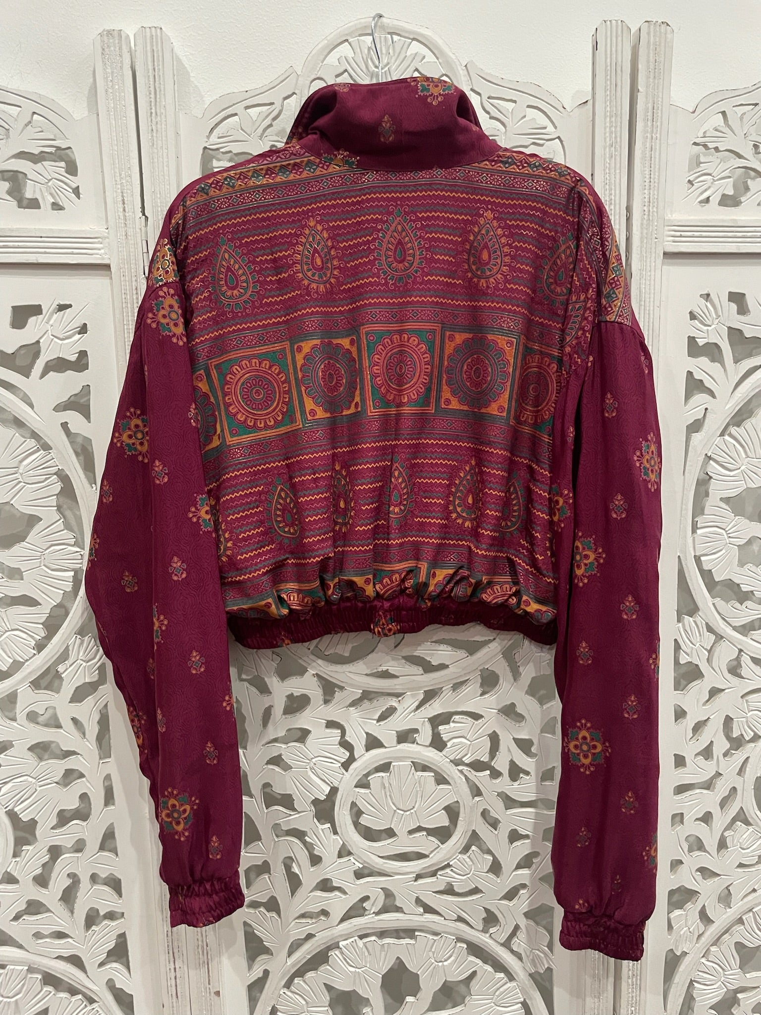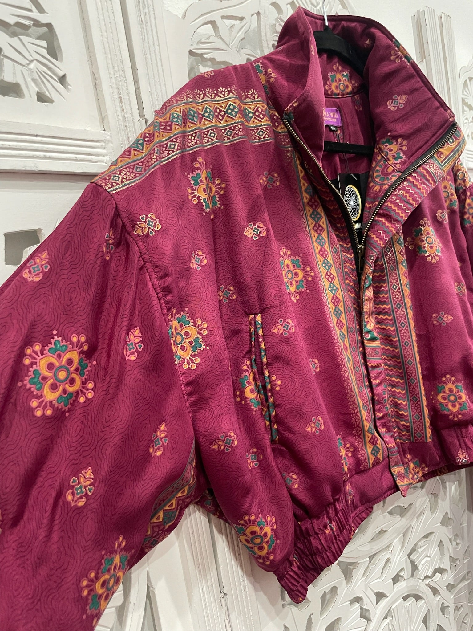 Each cropped bomber jacket flaunts an upcycled Indian sari, black cotton inner bodice lining, zipped inner stash pocket, two open outer pockets, and a cropped cuffed waist and sleeves.