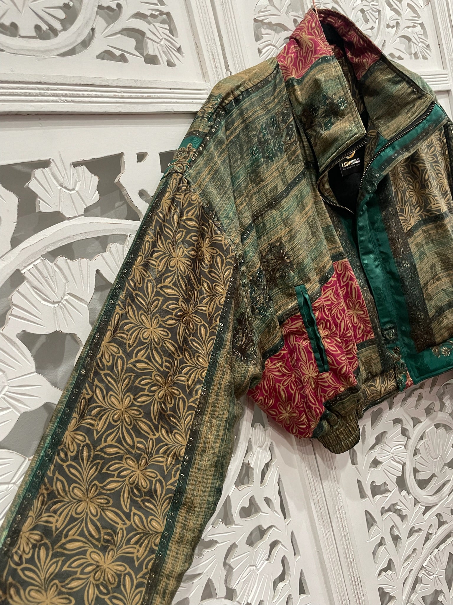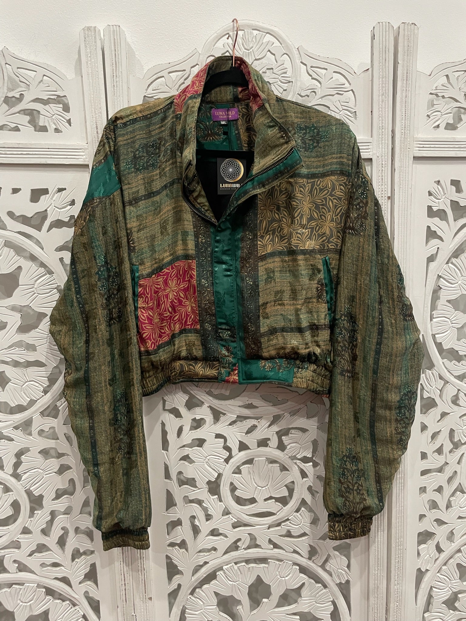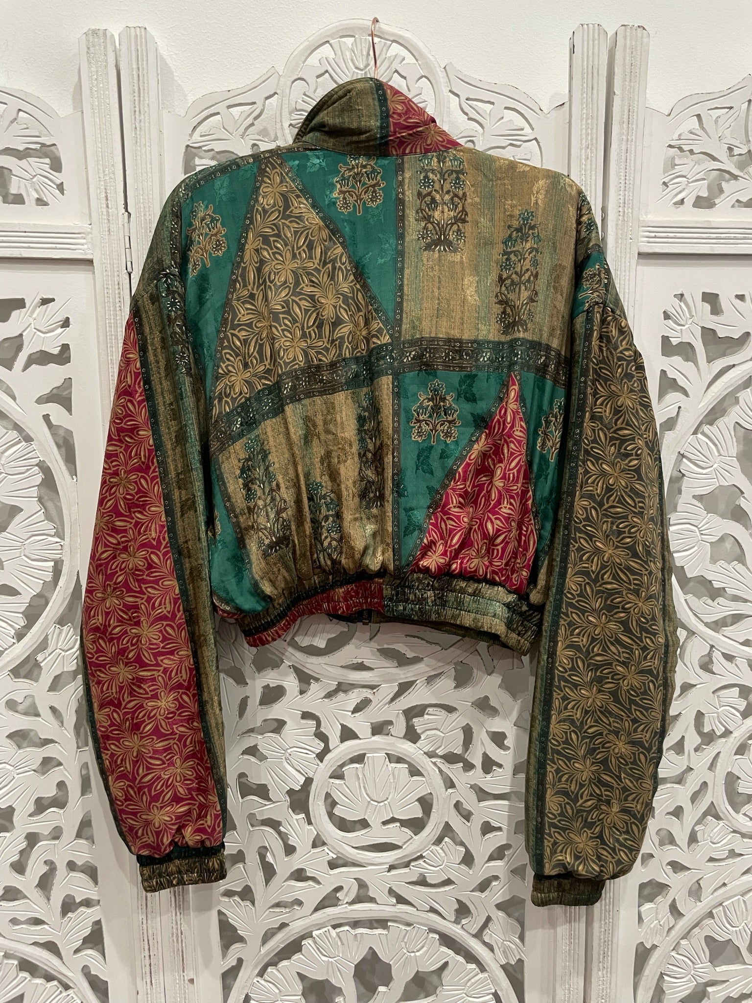 Each cropped bomber jacket flaunts an upcycled Indian sari, black cotton inner bodice lining, zipped inner stash pocket, two open outer pockets, and a cropped cuffed waist and sleeves.