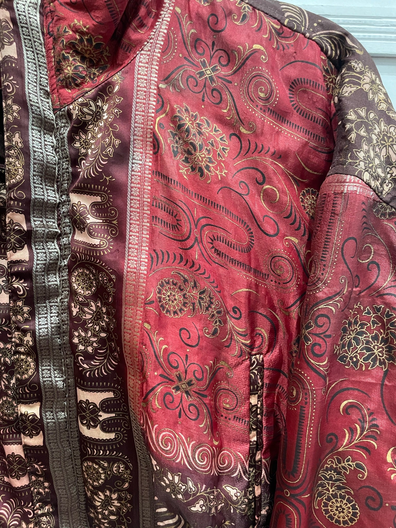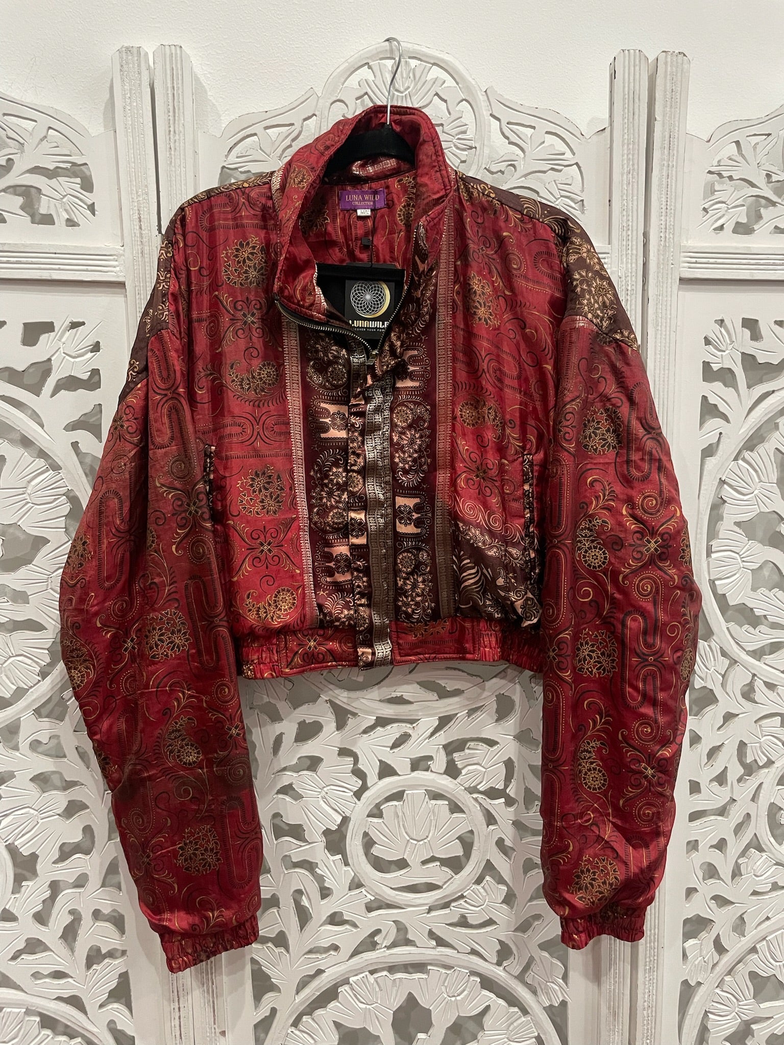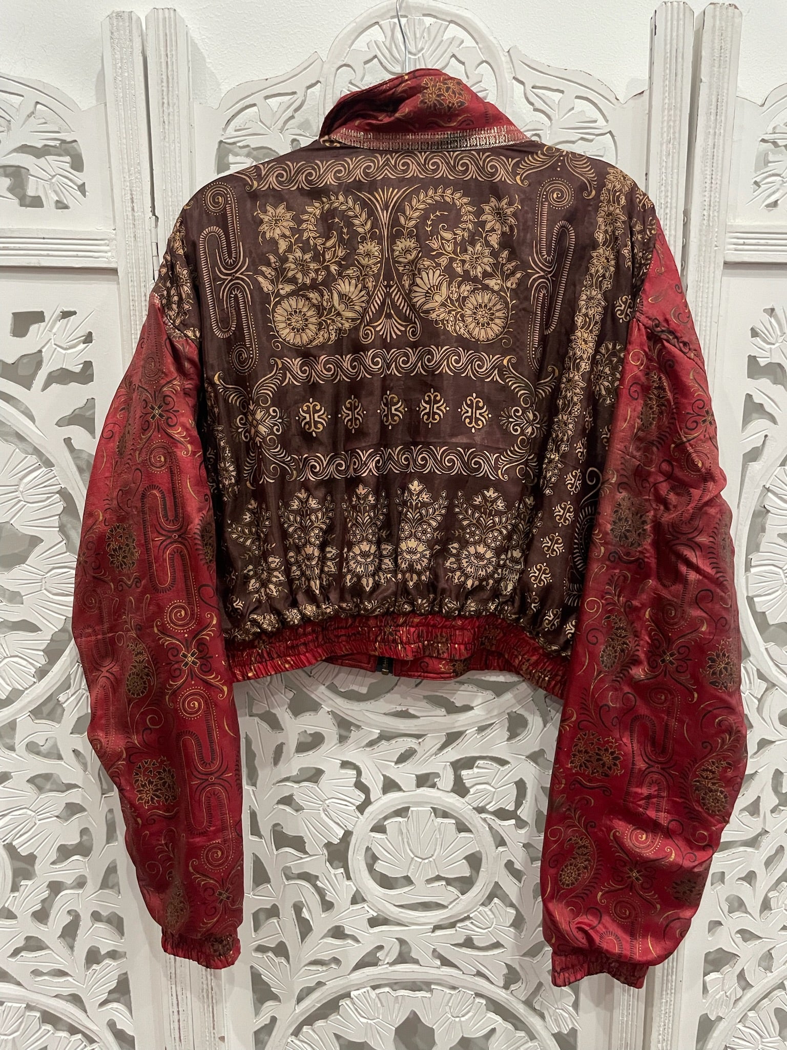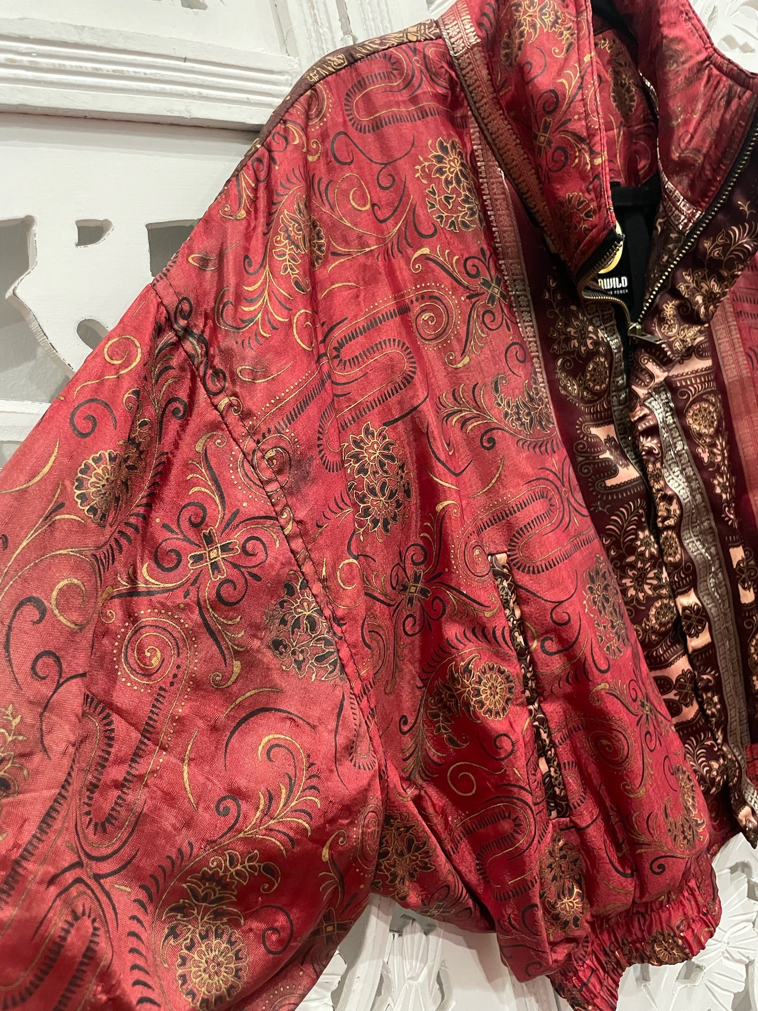 Each cropped bomber jacket flaunts an upcycled Indian sari, black cotton inner bodice lining, zipped inner stash pocket, two open outer pockets, and a cropped cuffed waist and sleeves.