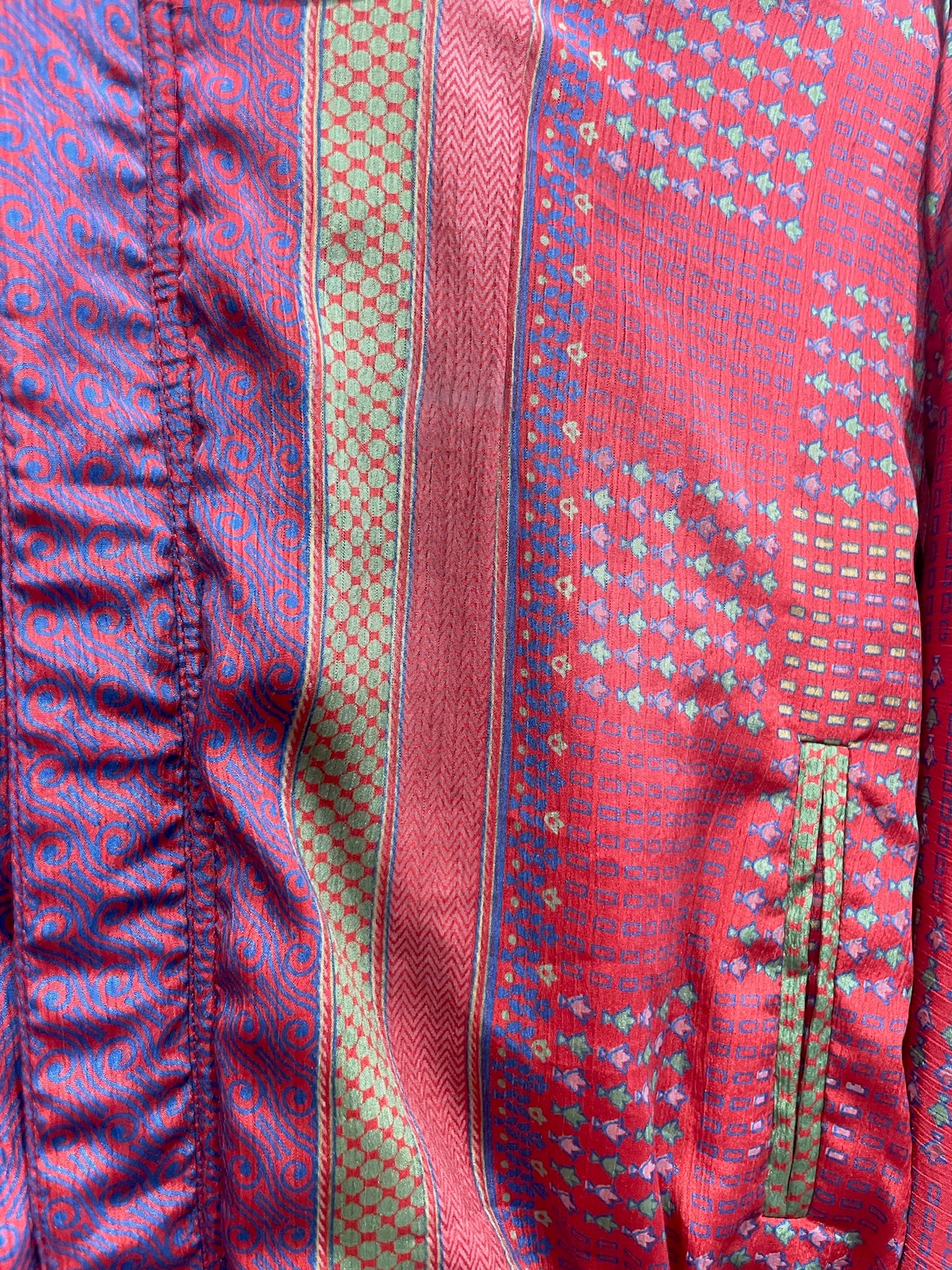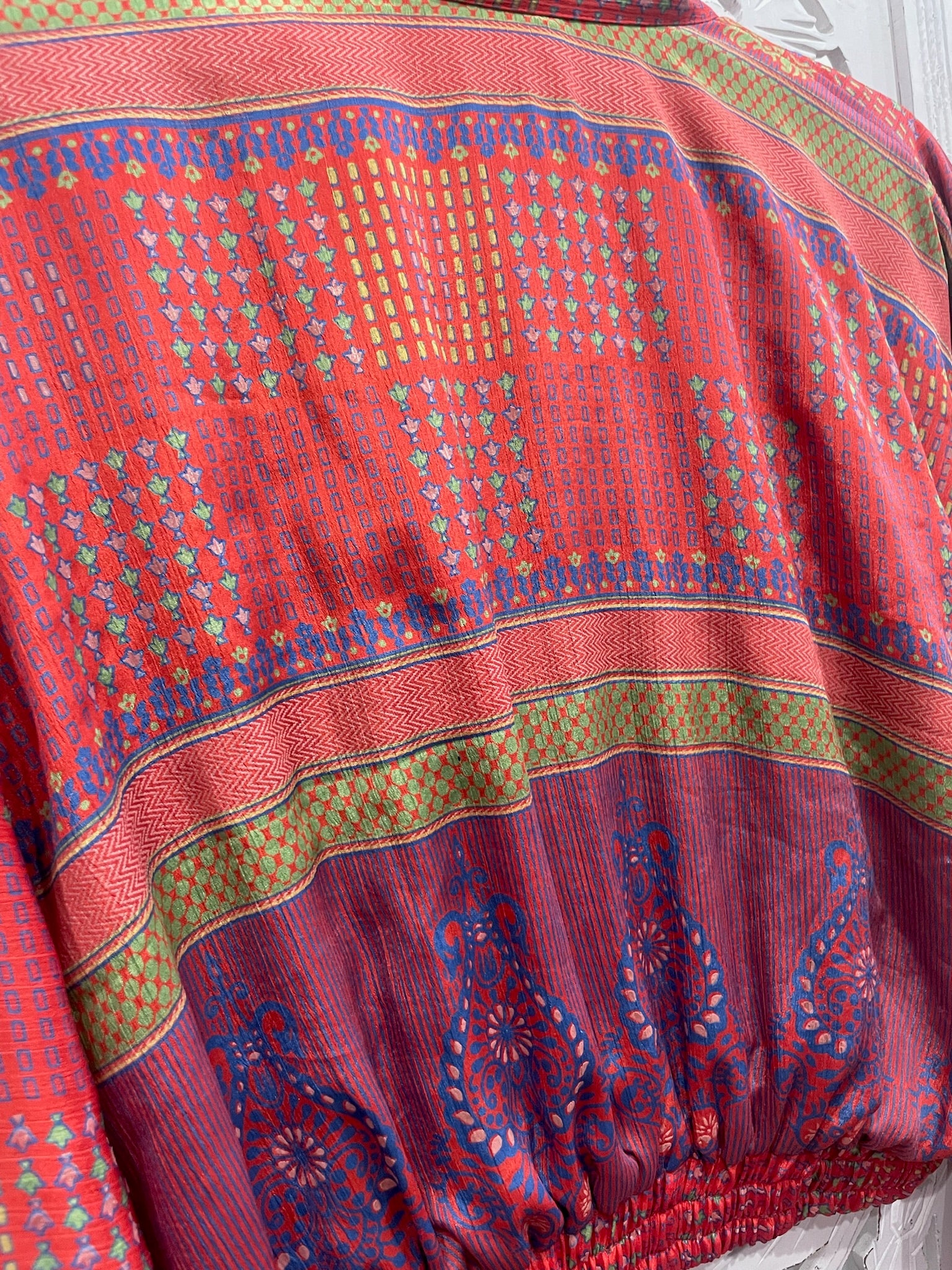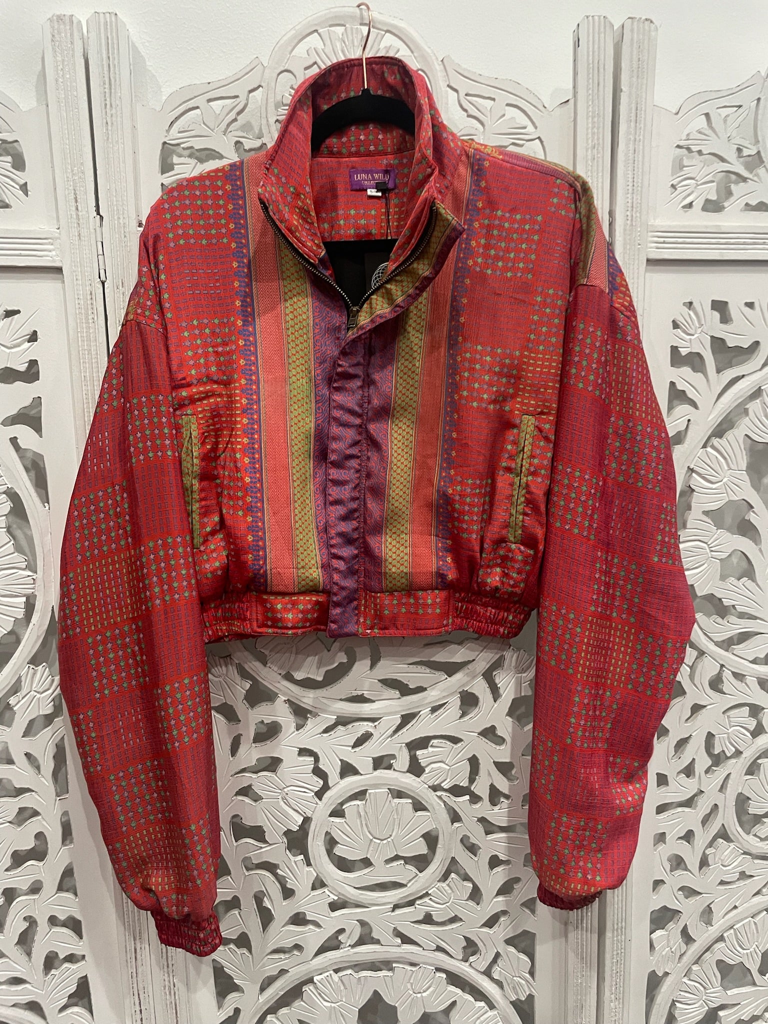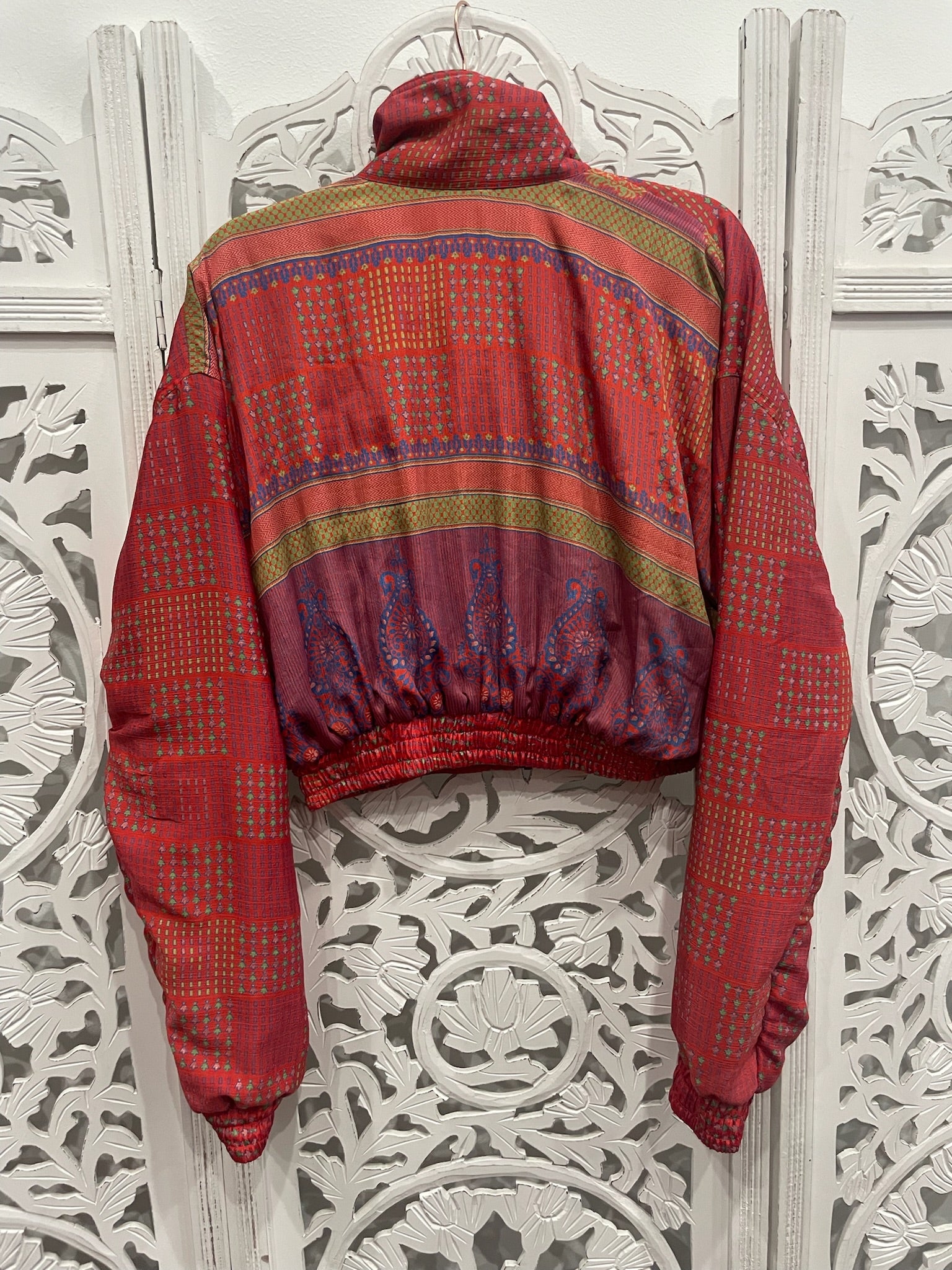 Each cropped bomber jacket flaunts an upcycled Indian sari, black cotton inner bodice lining, zipped inner stash pocket, two open outer pockets, and a cropped cuffed waist and sleeves.